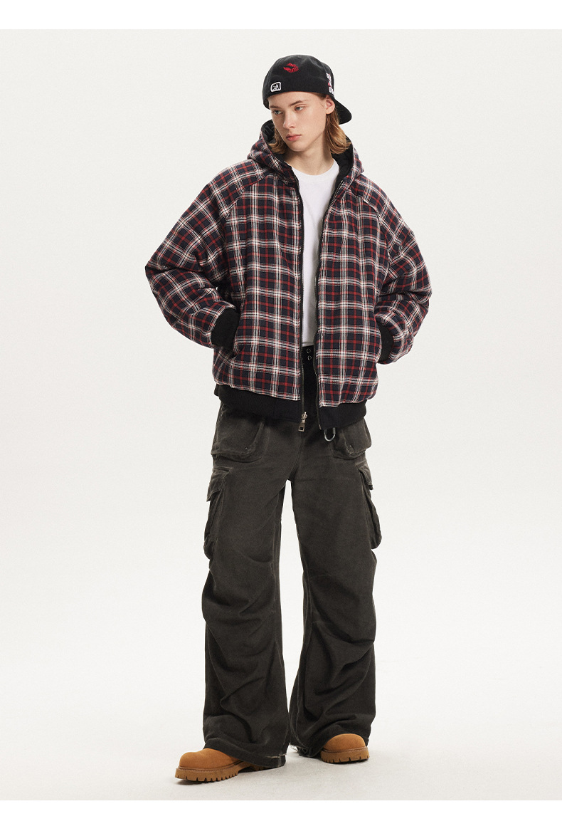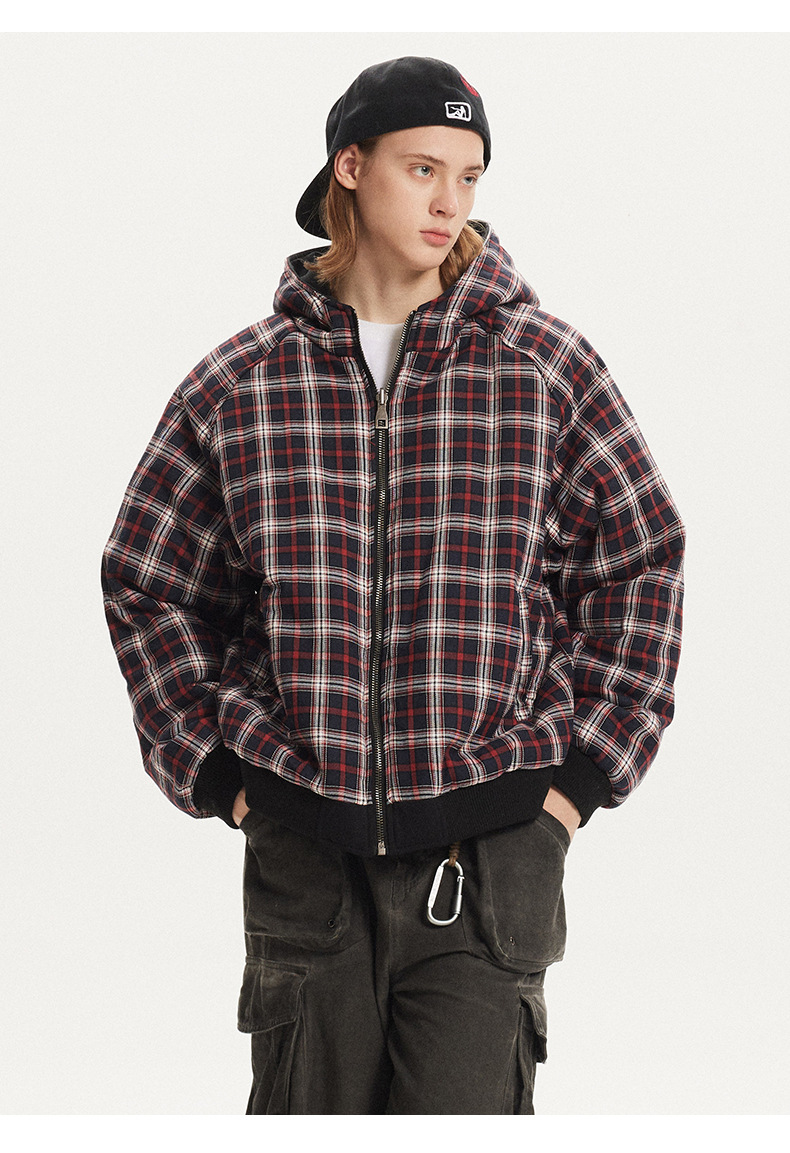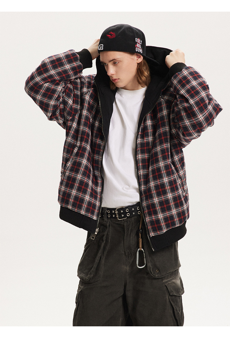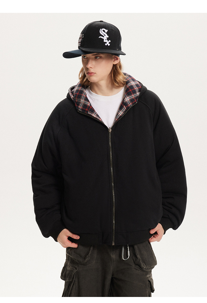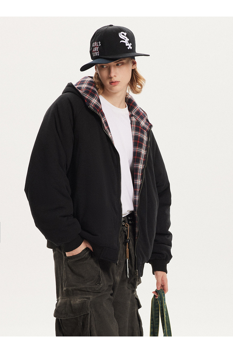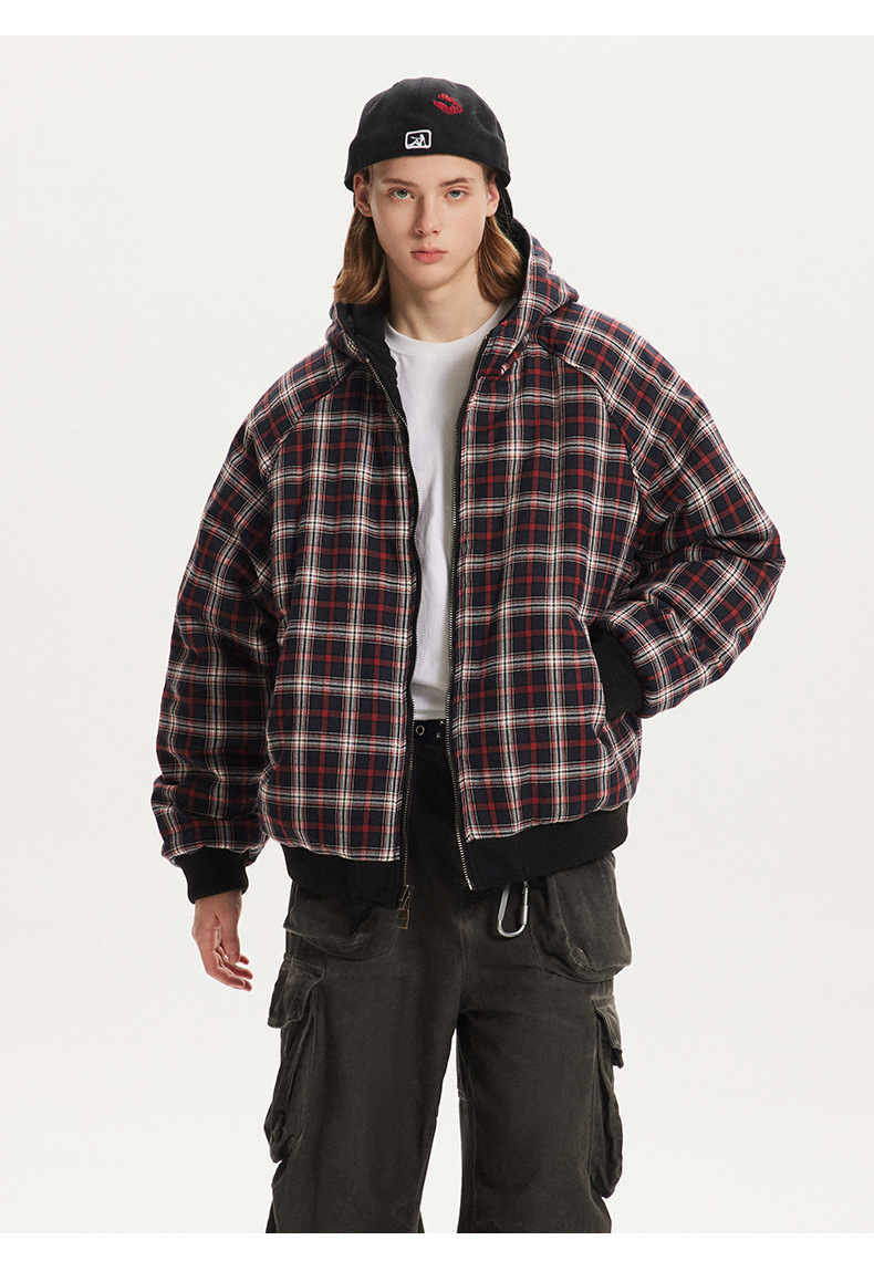 MADEEXTREME Thickened Plaid Double-sided Zip-up Hooded Cotton Jacket