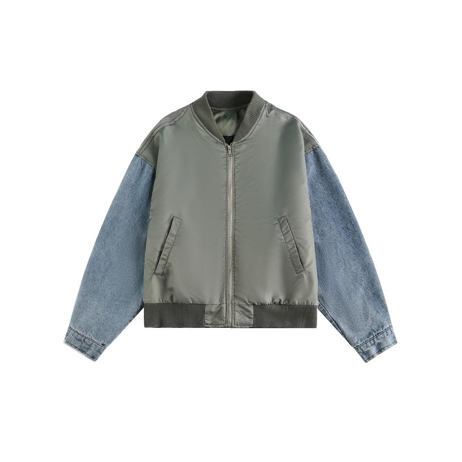 Introducing our Retro Patchwork Denim Sleeve MA1 Pilot Jacket, a stylish and comfortable outerwear choice for both men and women. This jacket beautifully merges classic design elements with a modern twist, featuring unique denim sleeves that elevate its vintage appeal.