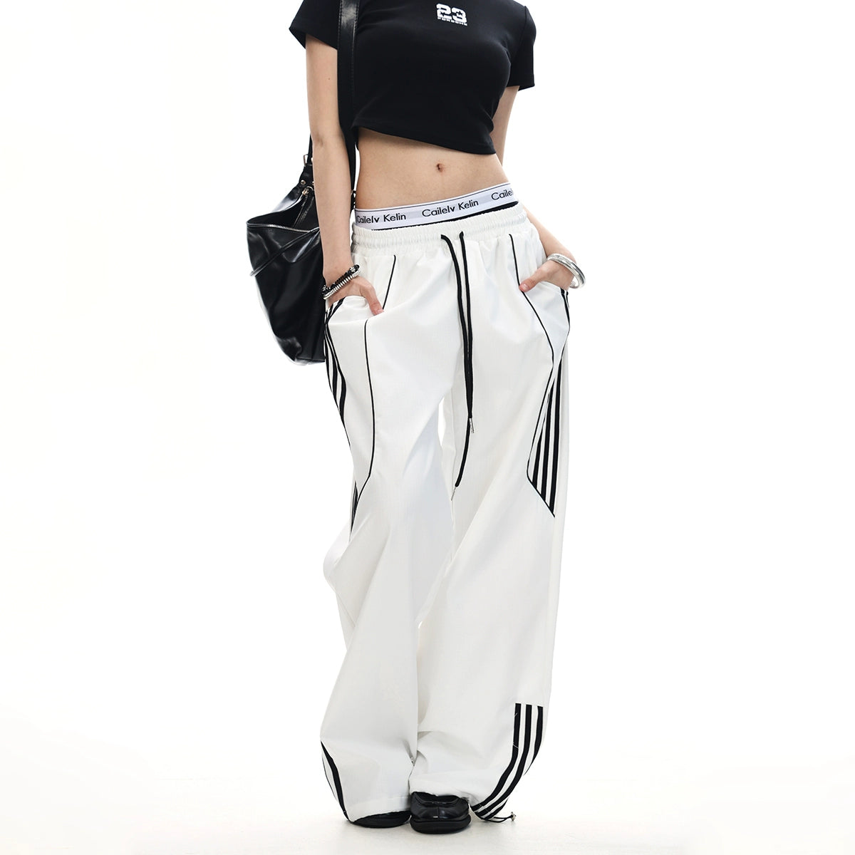 Featuring a striking design, the pants come adorned with white athletic stripes along the side seams and at the pant cuffs, adding a sporty flair that sets them apart. The elastic waistband combined with the drawstring design allows for a customizable fit, ensuring you feel comfortable and secure during any activity.