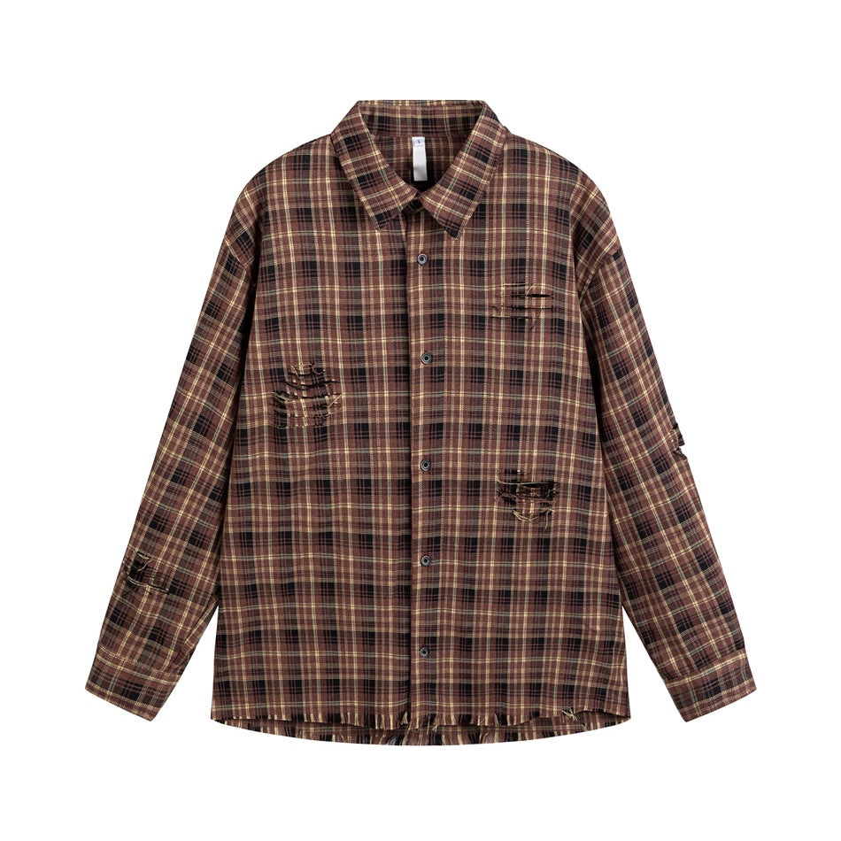 Introducing our stylish and versatile long-sleeve checkered shirt, designed with a contemporary cut and edgy distressed detailing. This shirt is a fresh embodiment of youthful fashion trends, seamlessly blending comfort with a modern aesthetic. The knife-cut holes add a unique touch, setting it apart as a standout piece in any wardrobe.