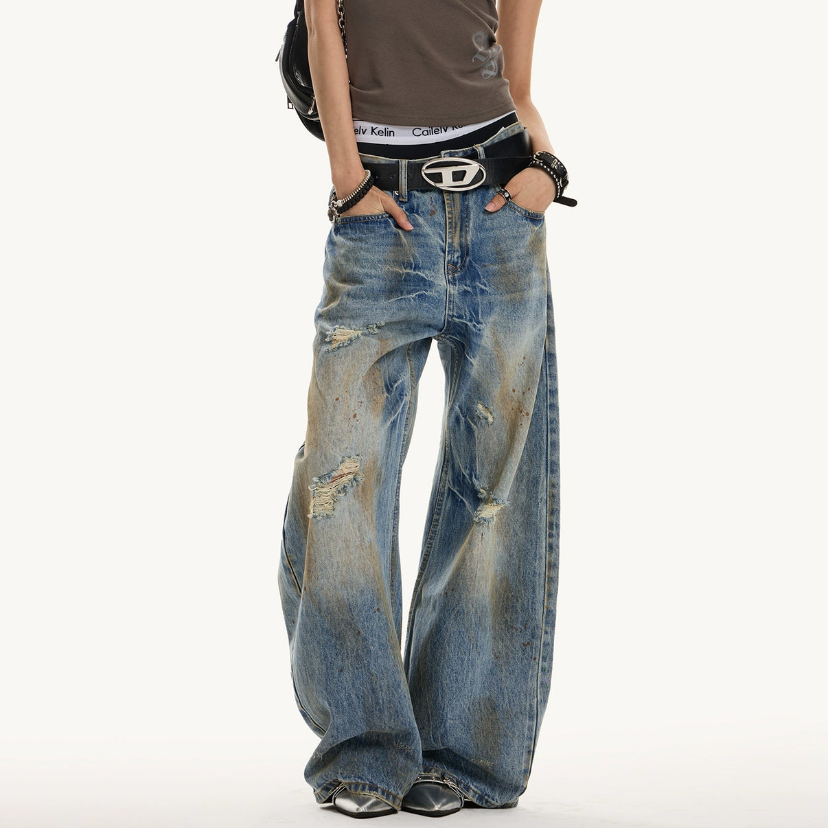 Our jeans highlight a distinctive *aged, brushed*, and *splattered* design that perfectly captures the essence of retro fashion. The carefully crafted distressed details and the loose, wide-leg fit ensure that you not only stand out but also feel relaxed throughout the day.