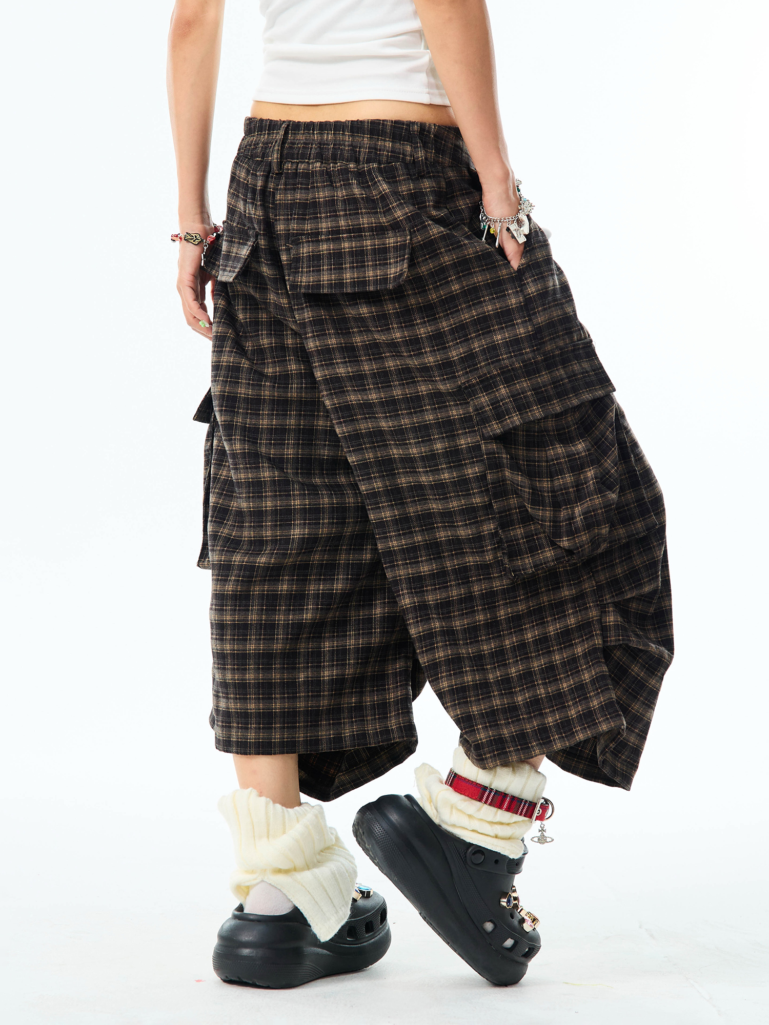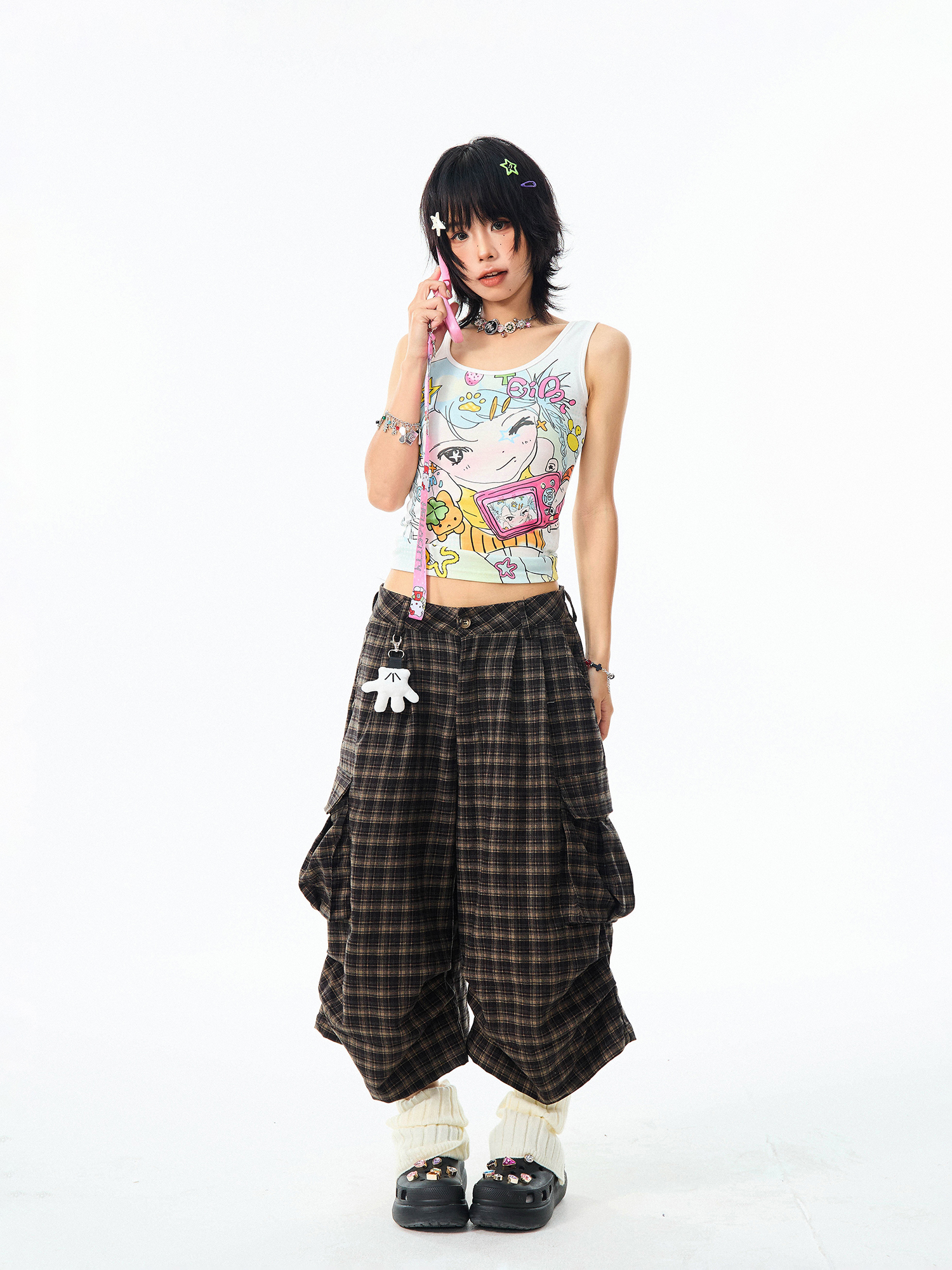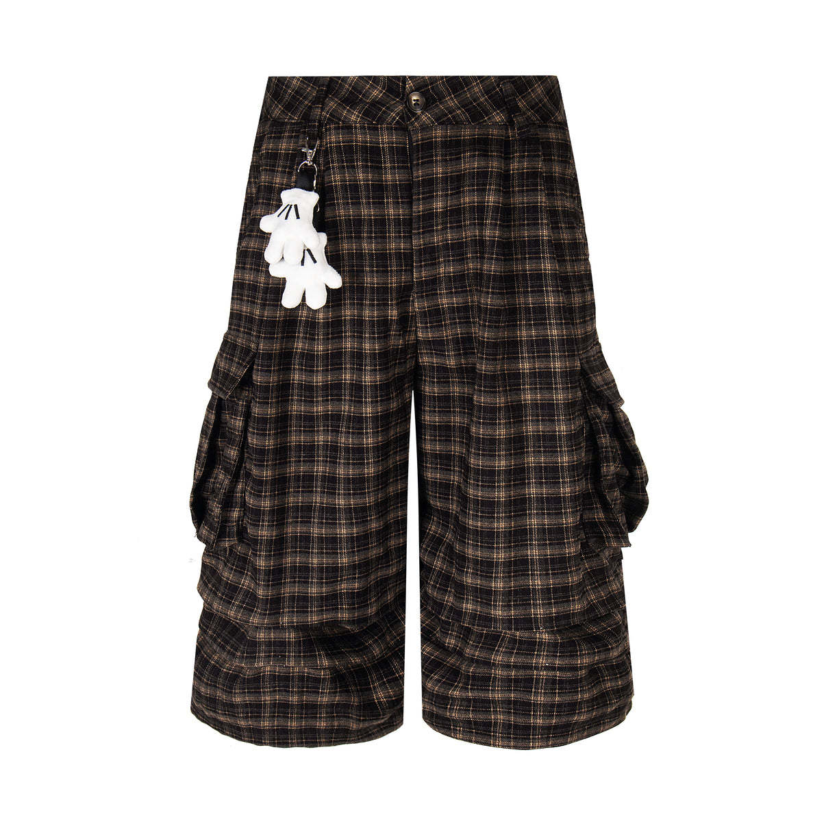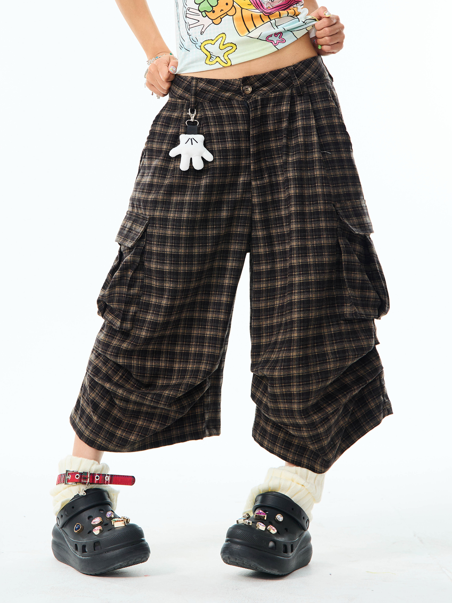 Jimmy The Crew Retro Palm Pendant Plaid Seven-point Loose Straight Wide-leg Cargo Pants