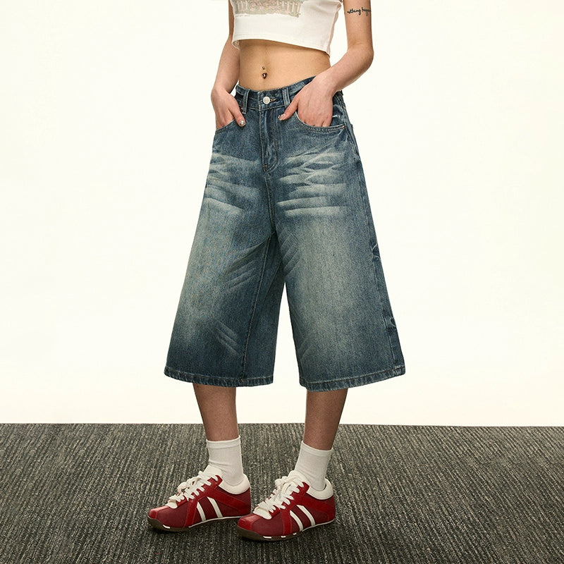 Jimmy Washed Old Cat Beard High Waist and Thin Wide Leg Cropped Pants Denim