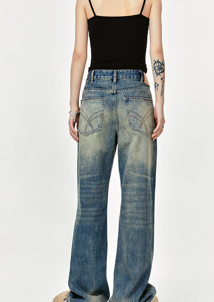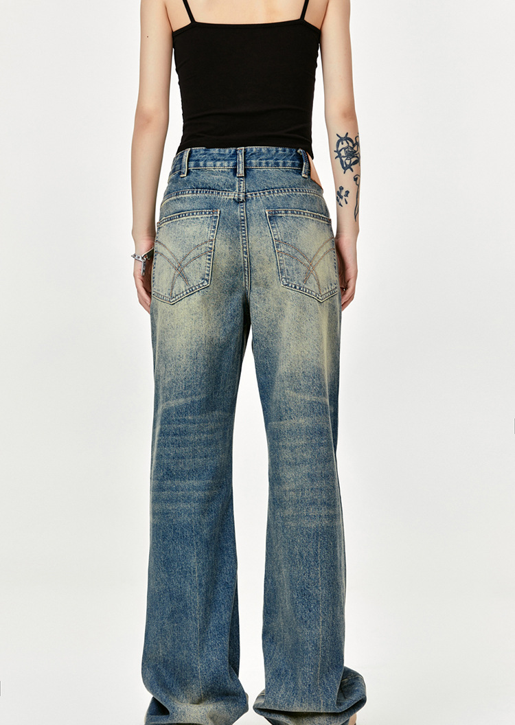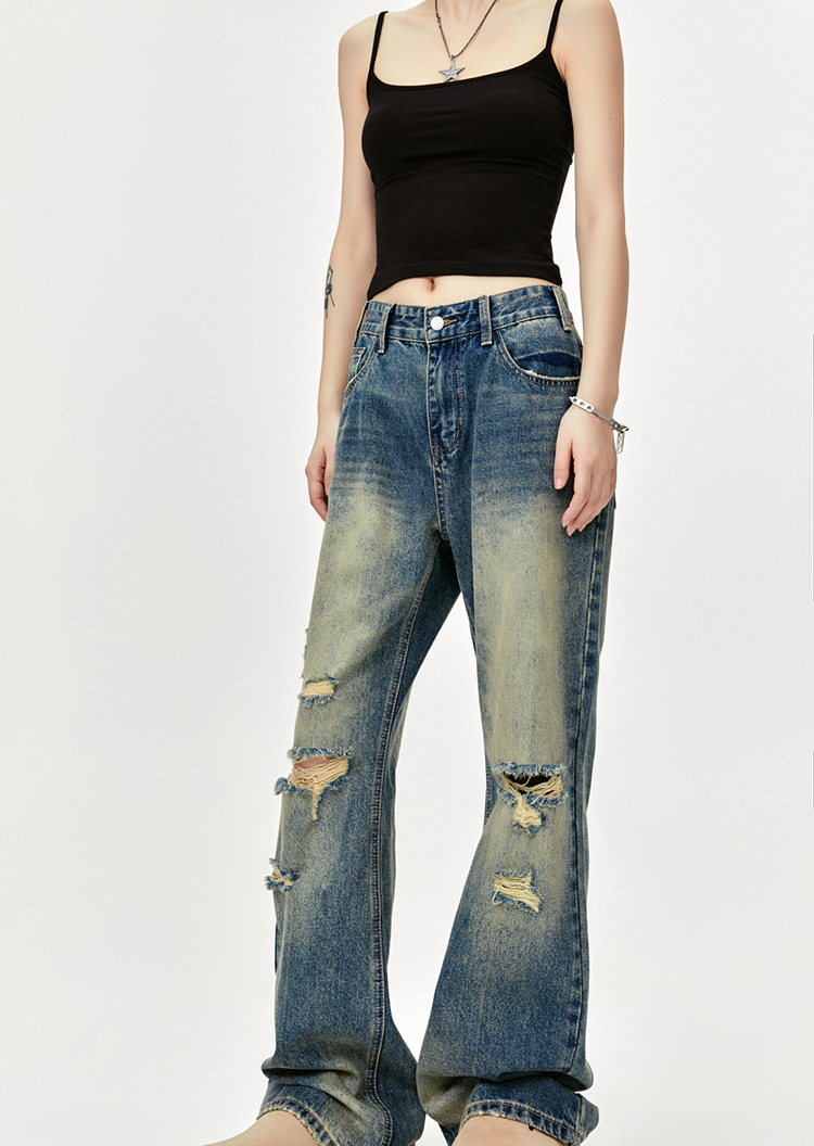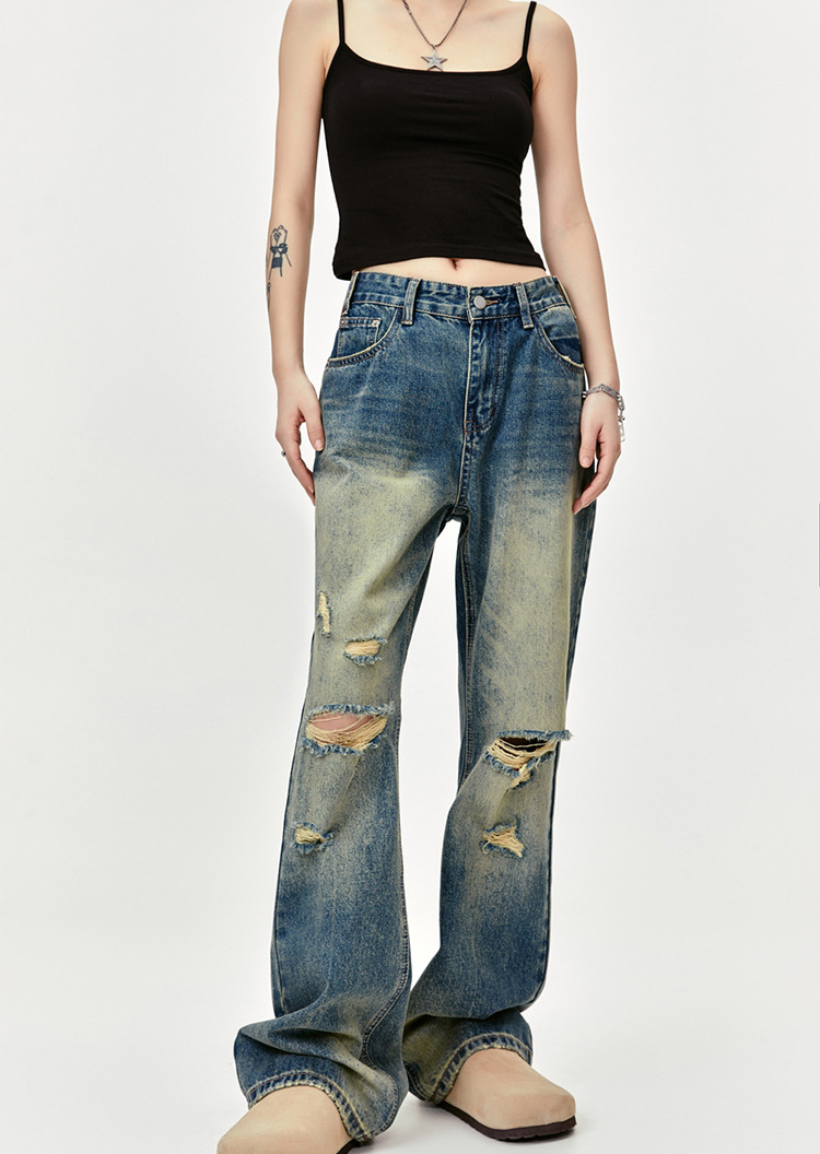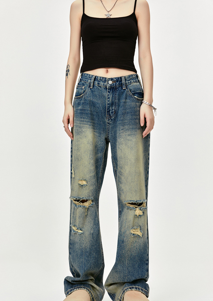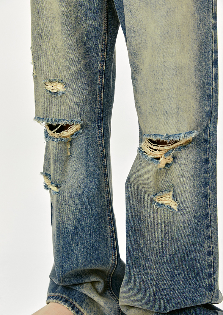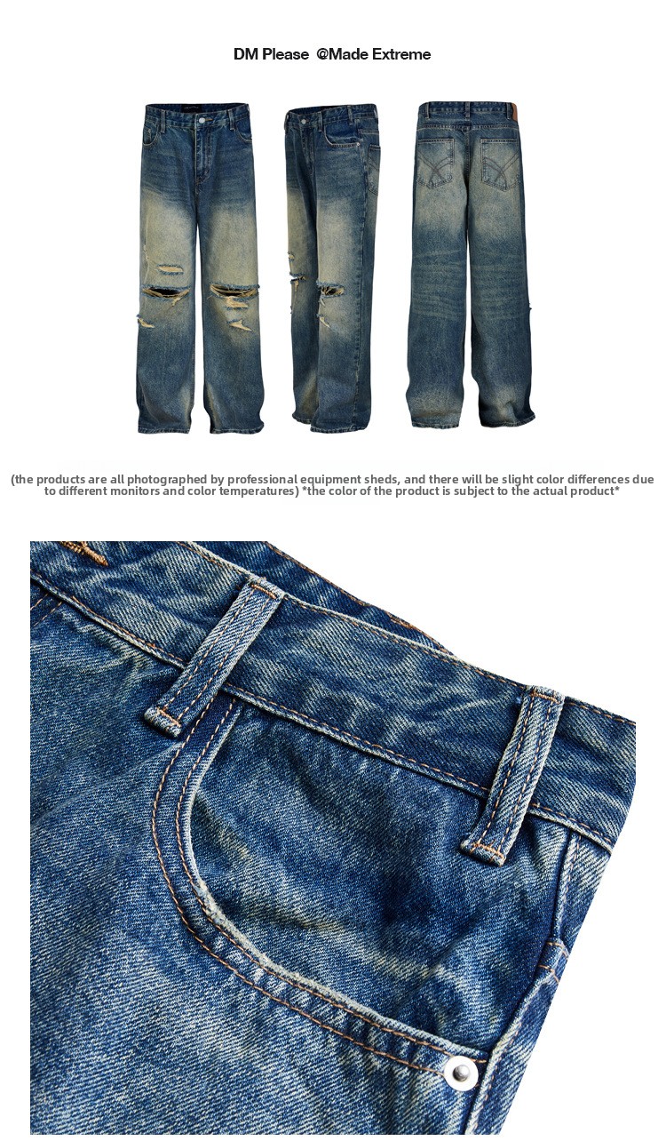 MADEEXTREME Retro Nostalgic Washed Ripped Cat Whisker Yellow Mud Wasteland Wind Straight Trousers Jeans