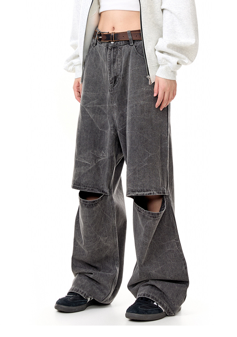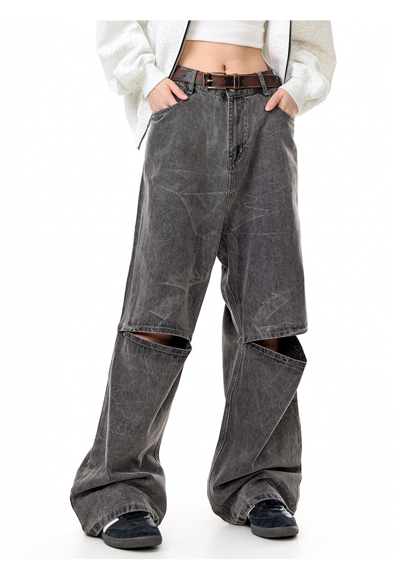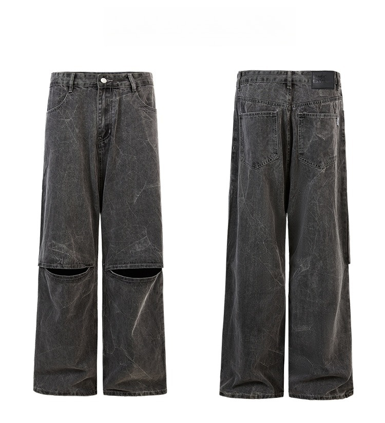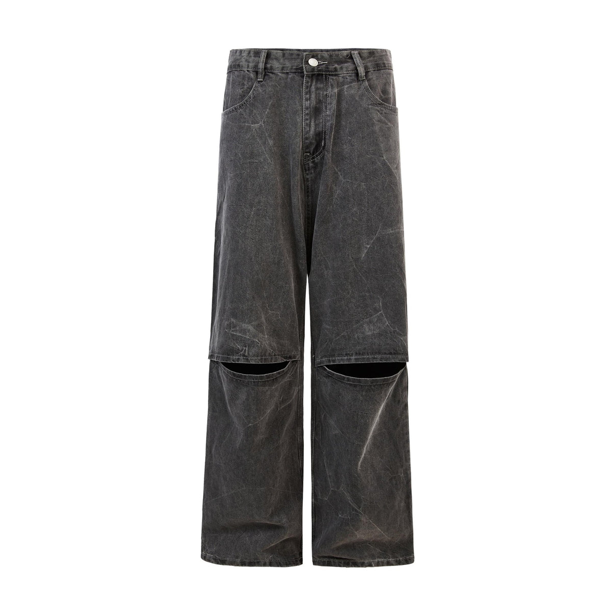 MADEEXTREME Washed Old Water Ripple Open Knee Straight Wide Leg Jeans