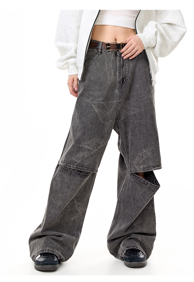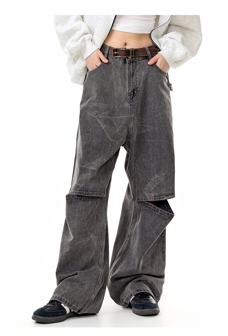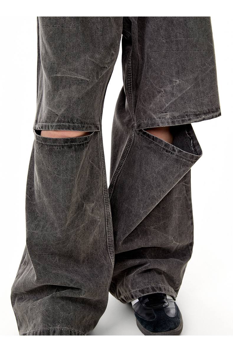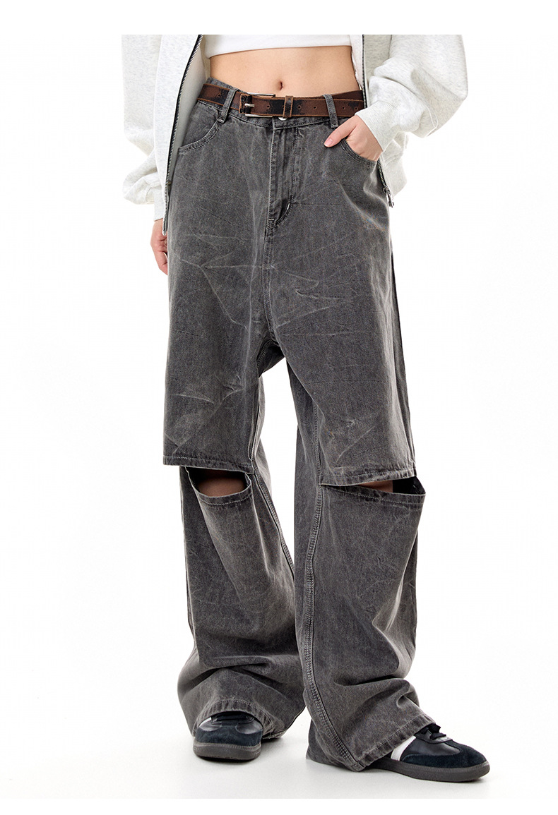 MADEEXTREME Washed Old Water Ripple Open Knee Straight Wide Leg Jeans