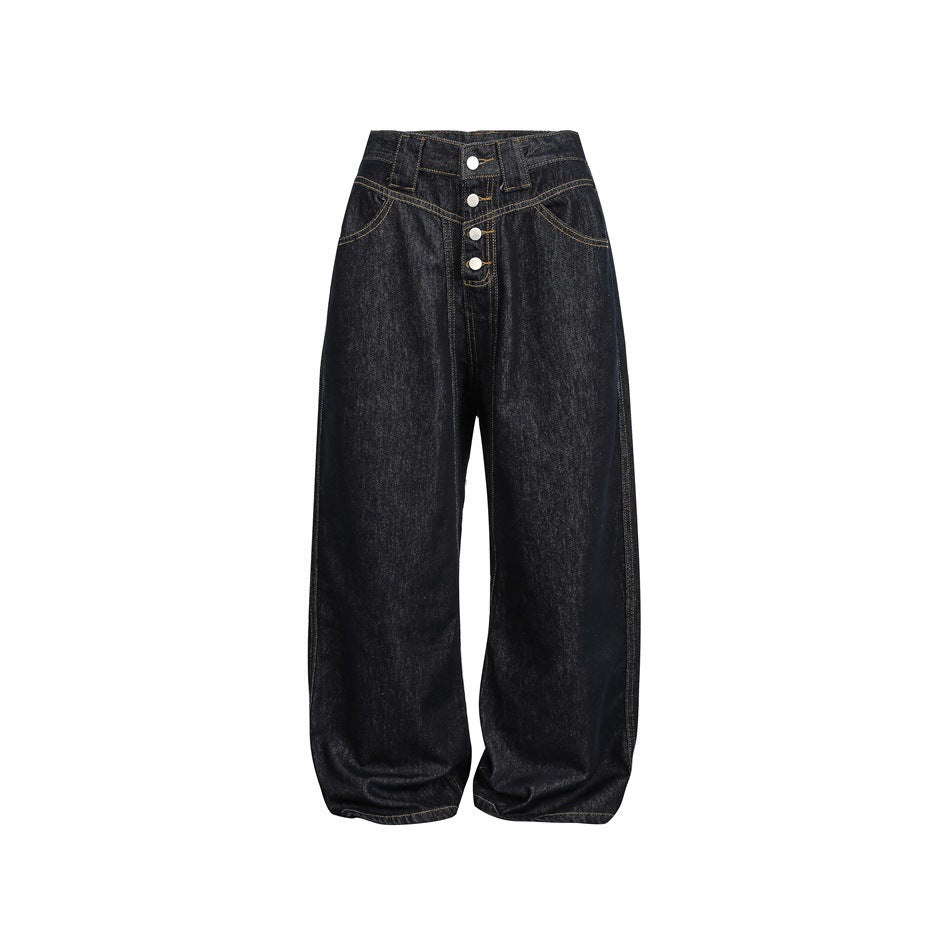 Crafted with a classic black denim, these wide-leg trousers offer a chic silhouette that lengthens your legs, making them an ideal addition to any fashion-forward wardrobe. The unique button fly adds a touch of vintage elegance, ensuring you stand out in style.