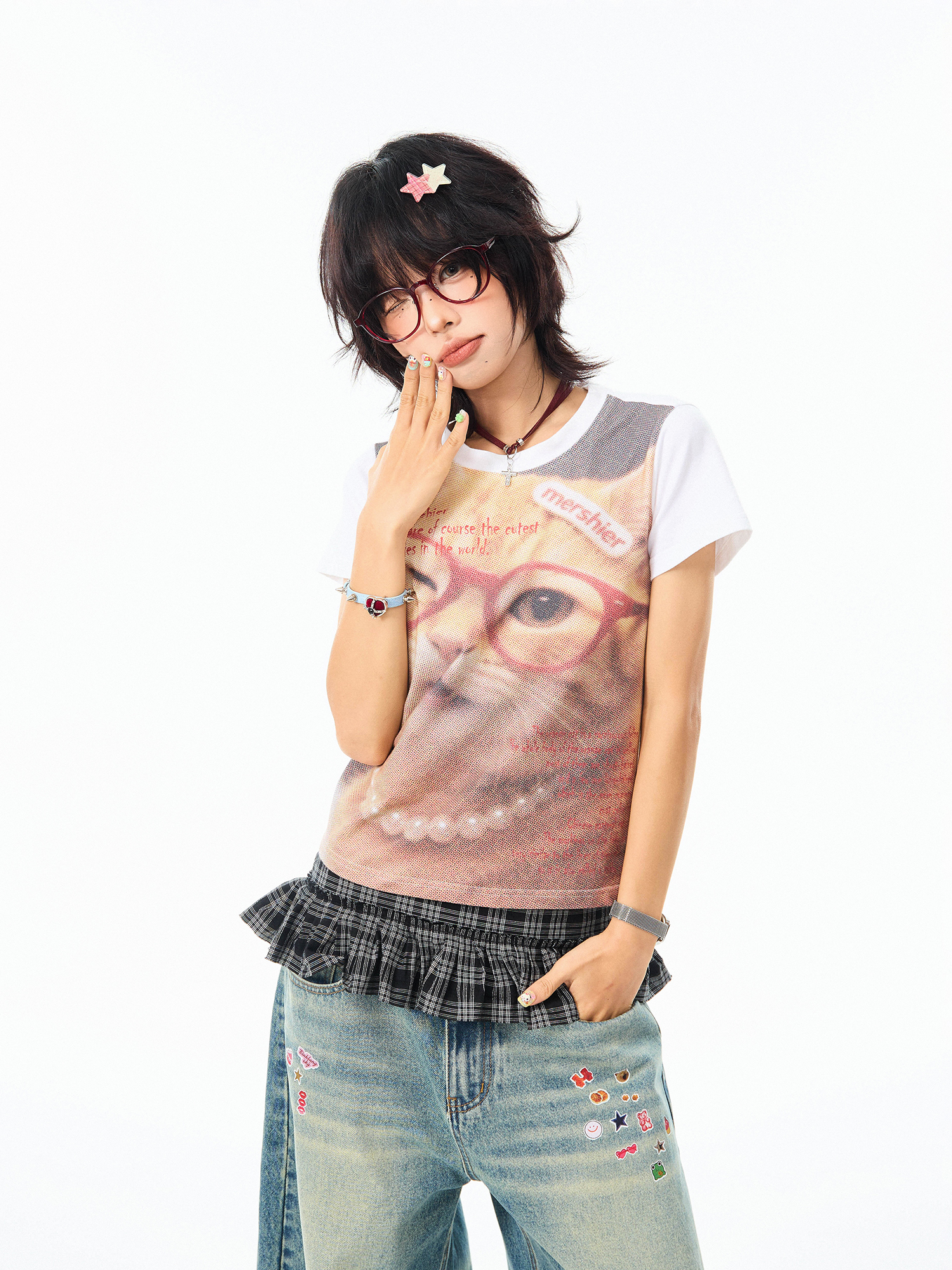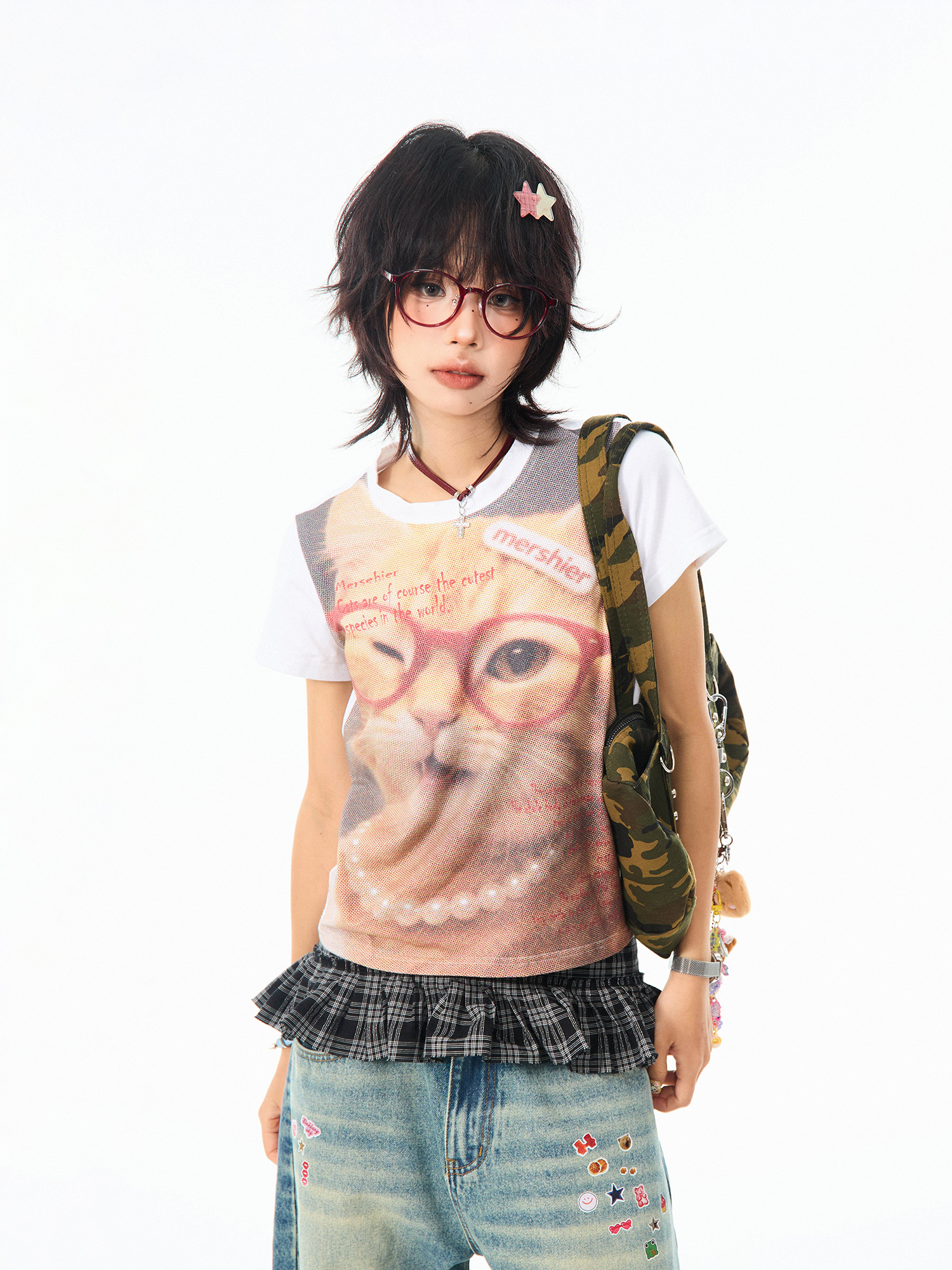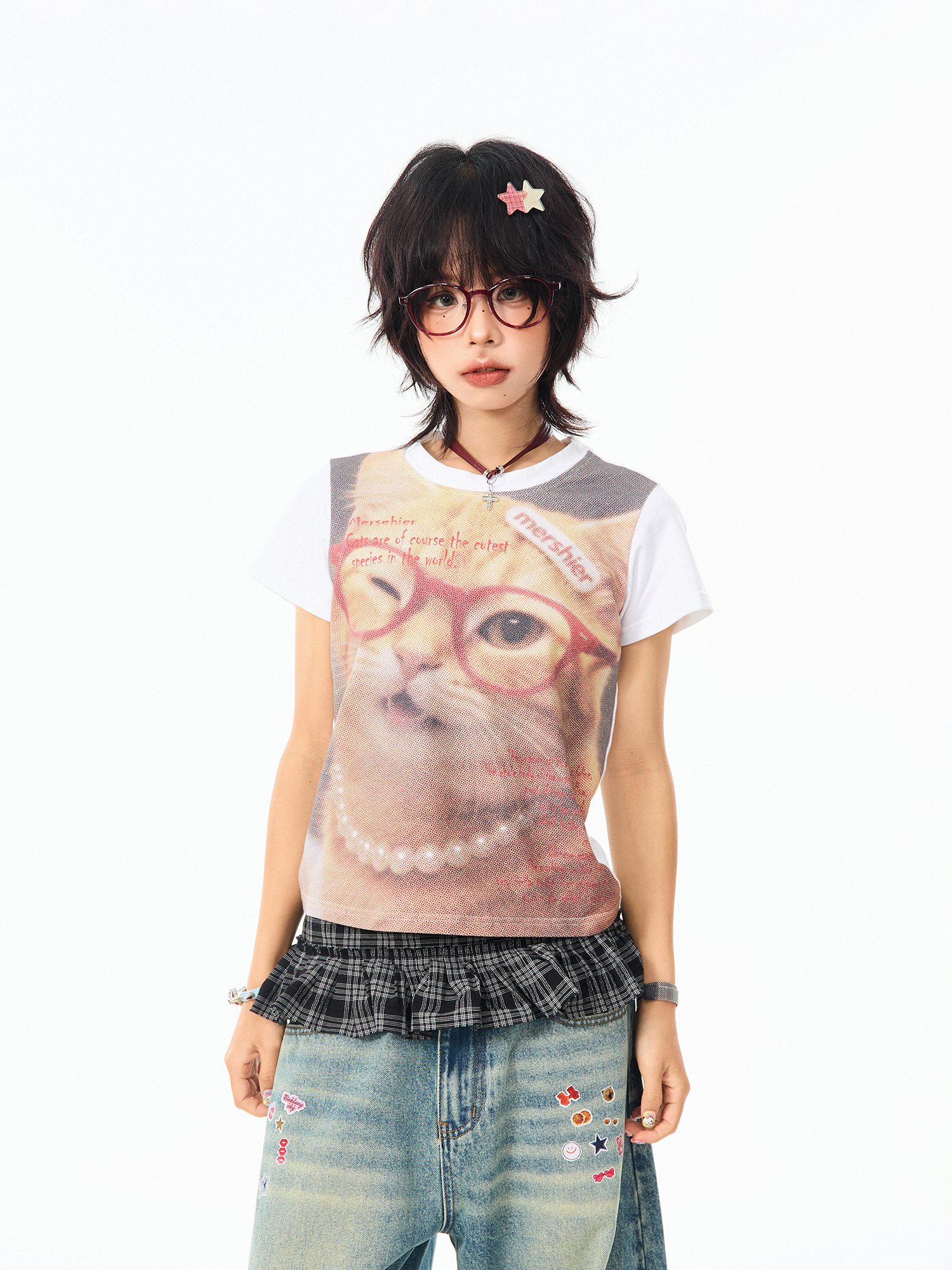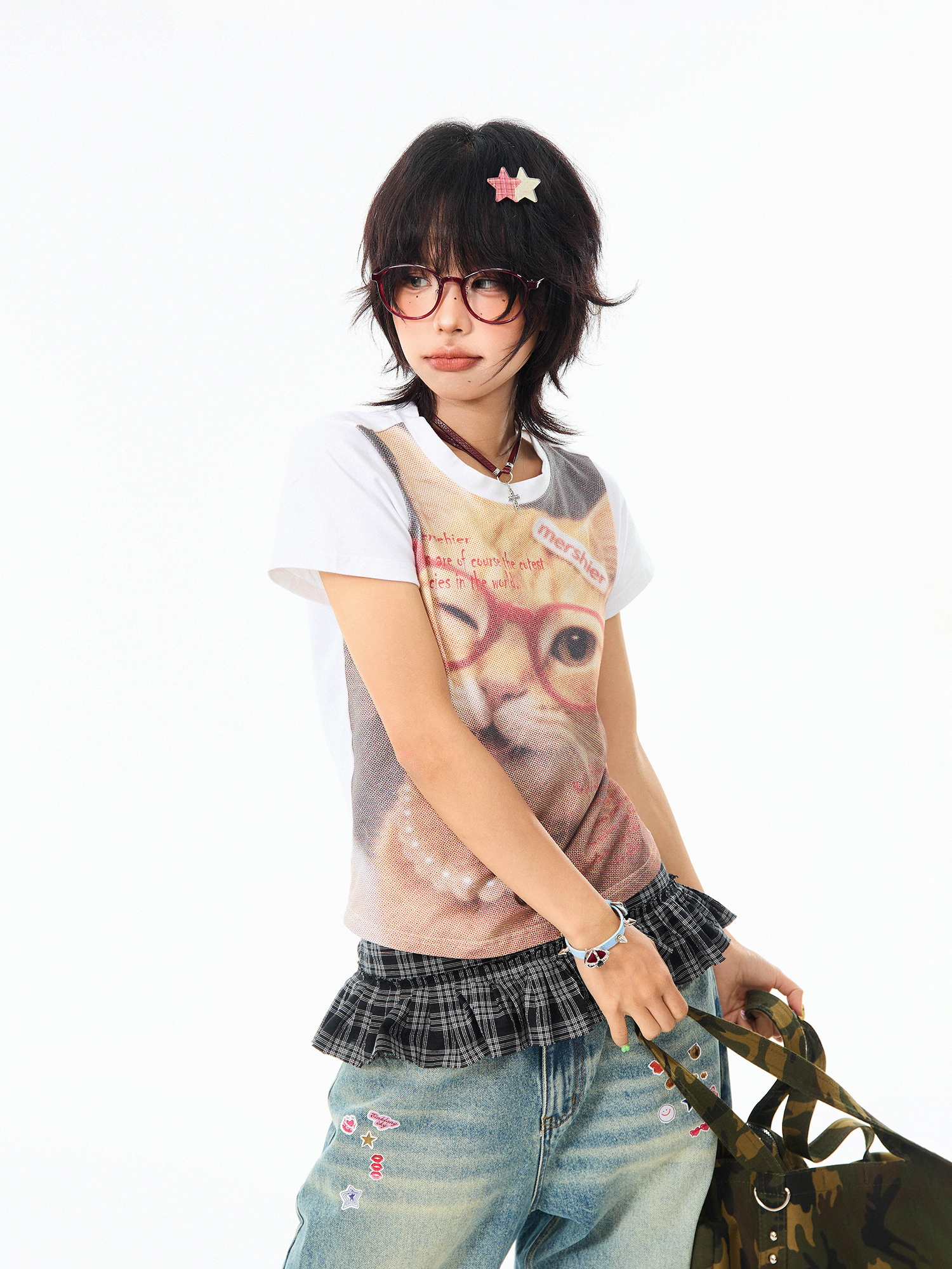 Jimmy The Crew Y2k Spice Girl Cat Front Shoulder Design Slim Skinny Short Sleeve T-Shirt