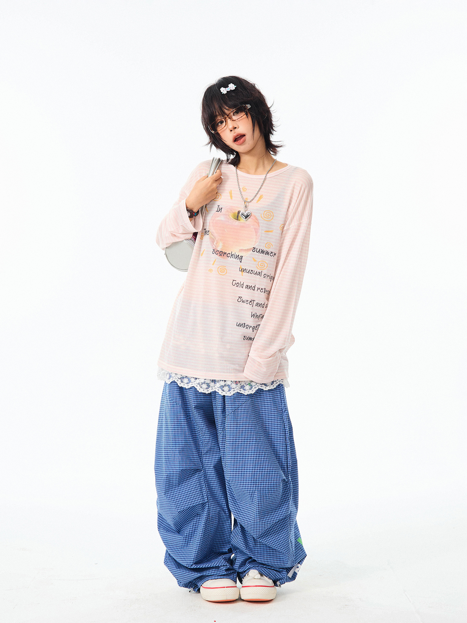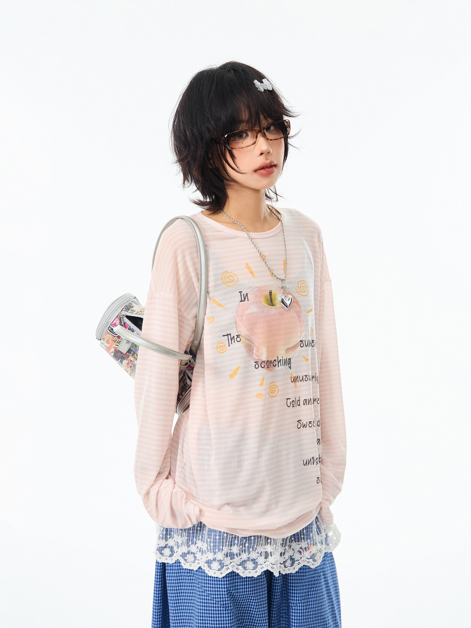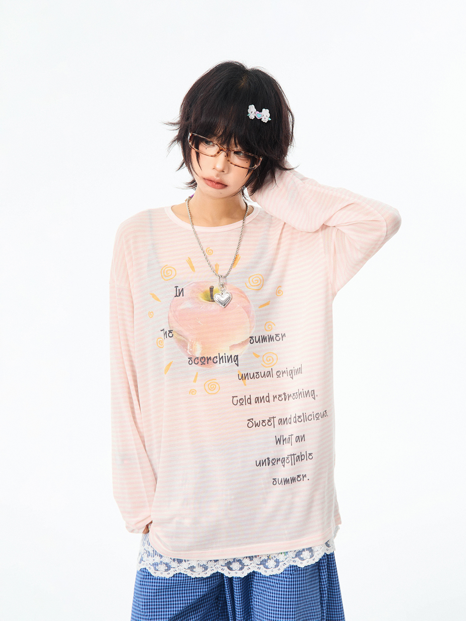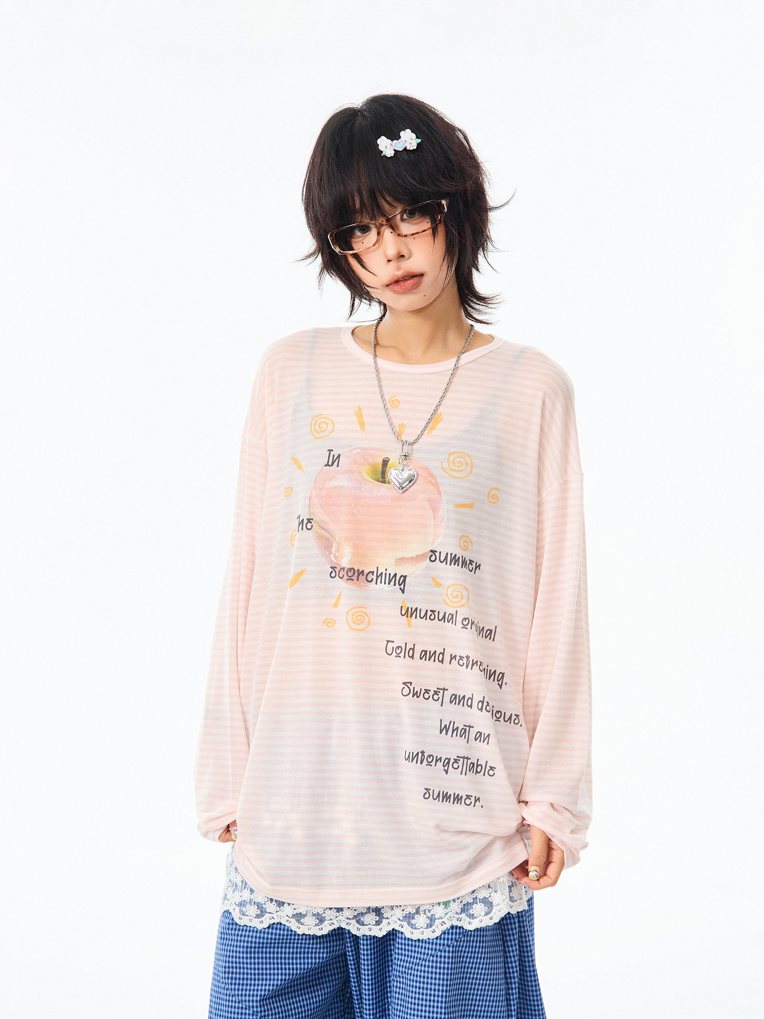Jimmy The Crew Fruit Print Lazy Wind Loose Micro Transparent Sunscreen Blouse Long Sleeve T-Shirt
