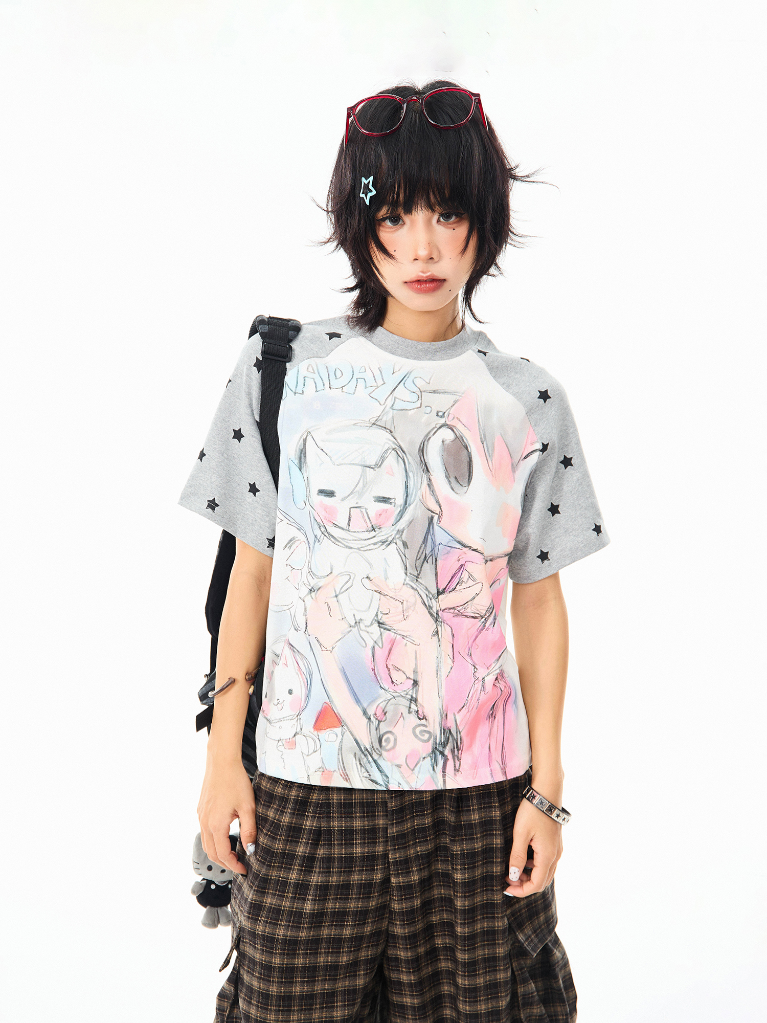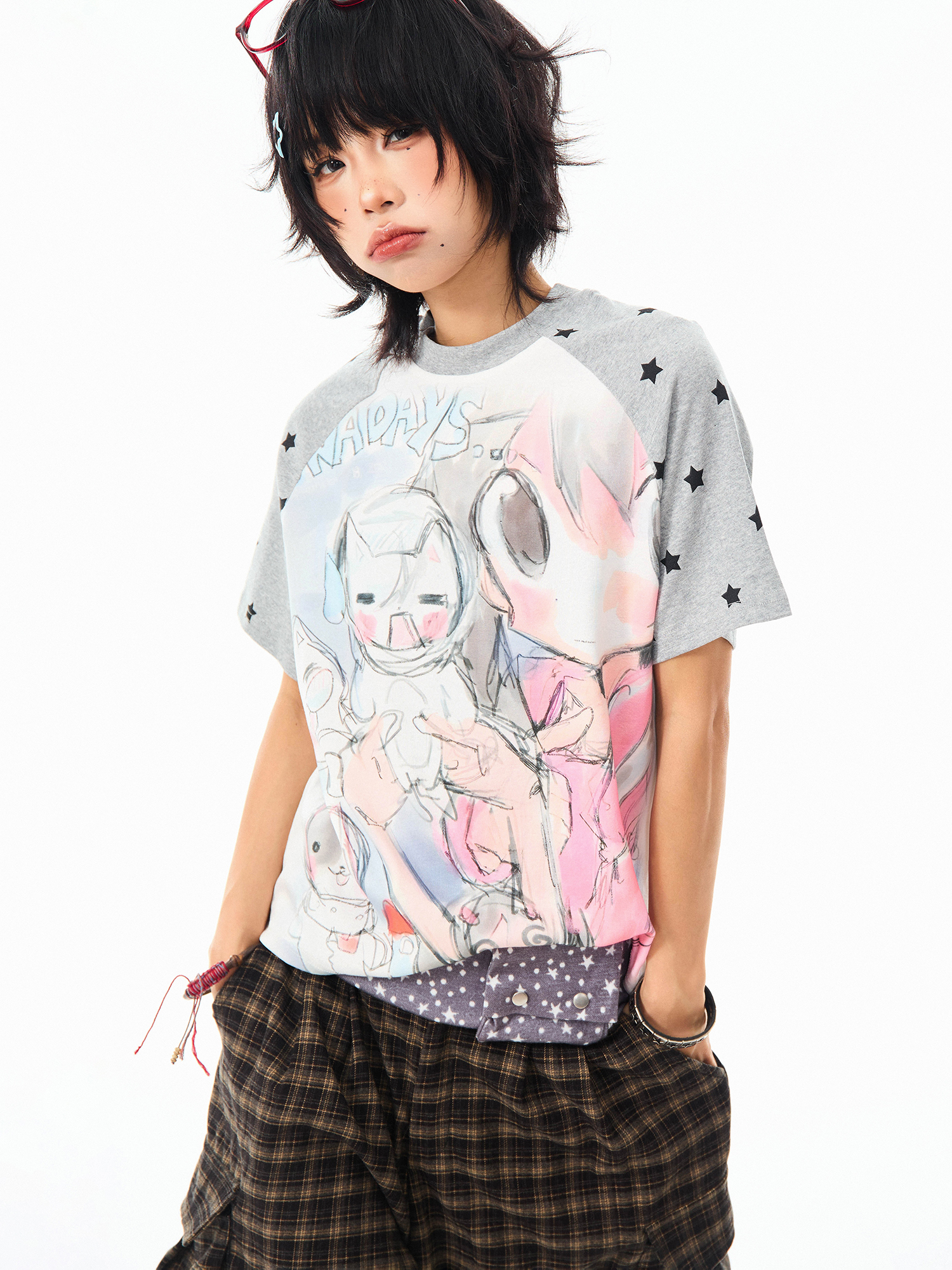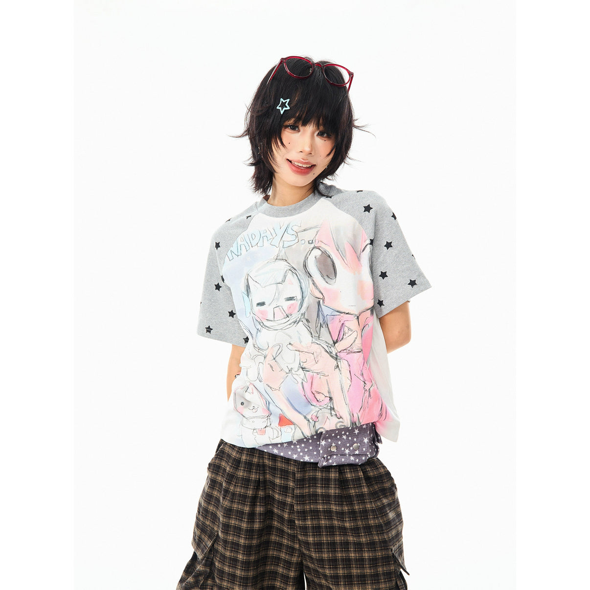 Jimmy The Crew Retro Cartoon Girl Star Plugged Shoulder Loose and Thin Short-sleeved T-shirt