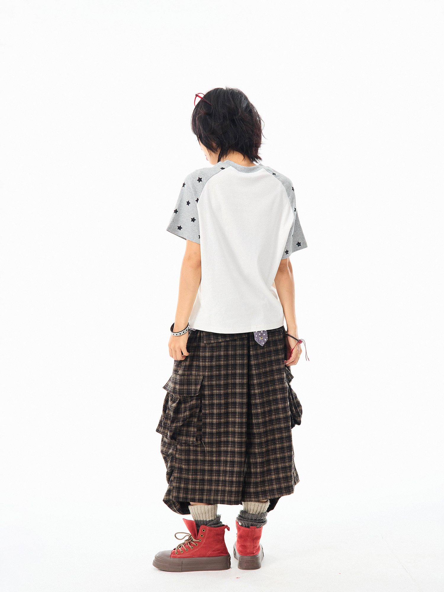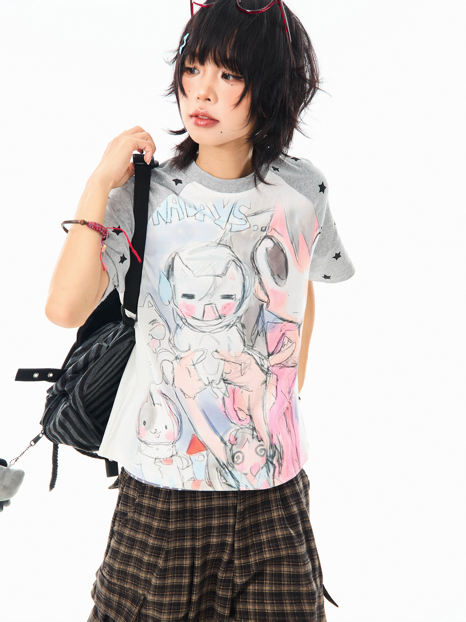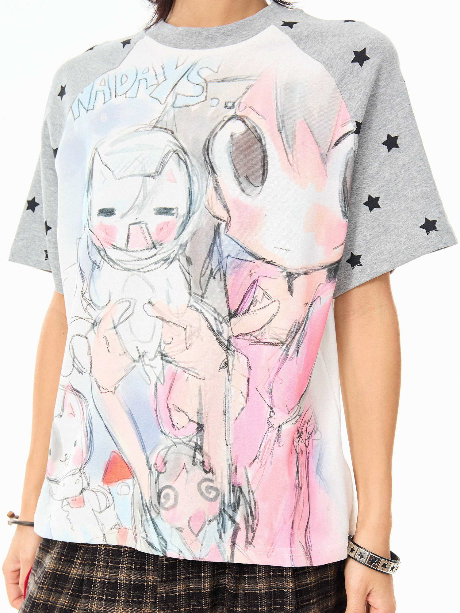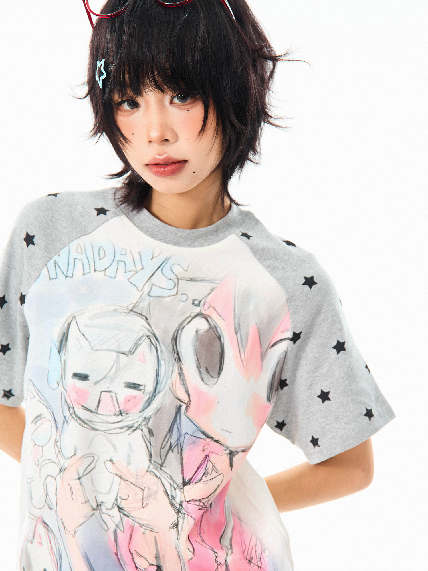 Jimmy The Crew Retro Cartoon Girl Star Plugged Shoulder Loose and Thin Short-sleeved T-shirt