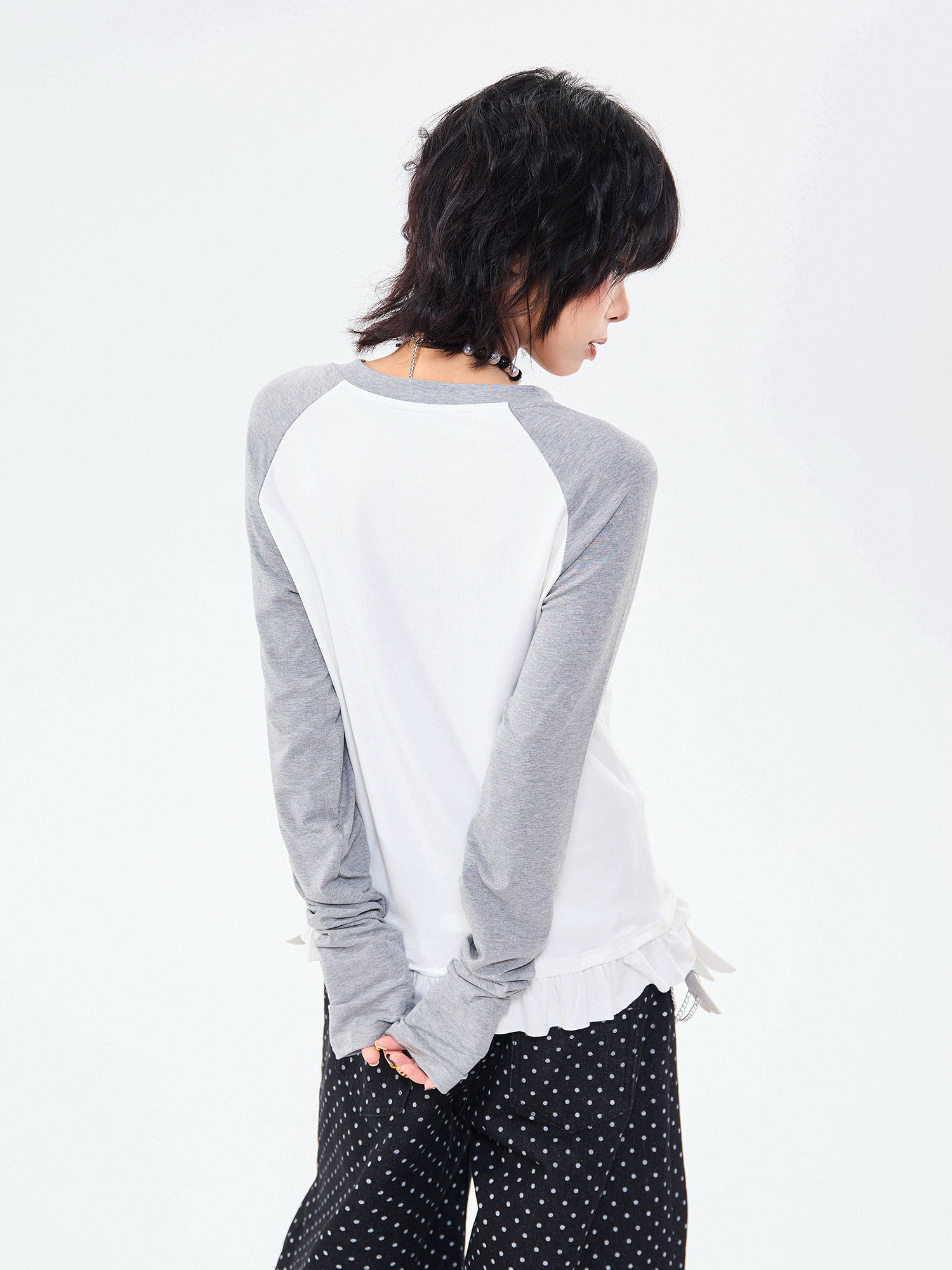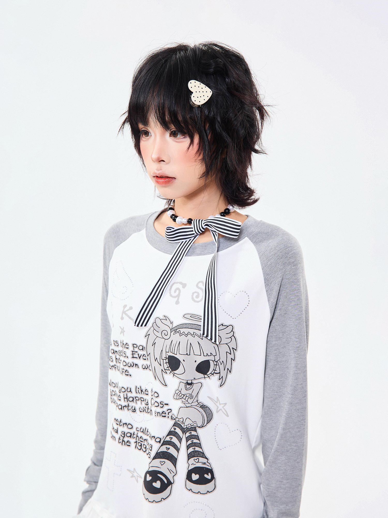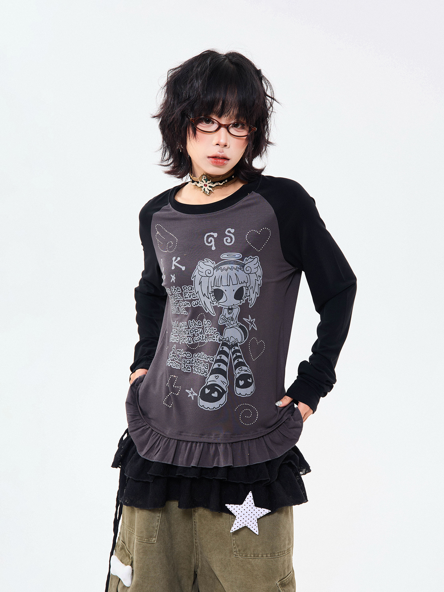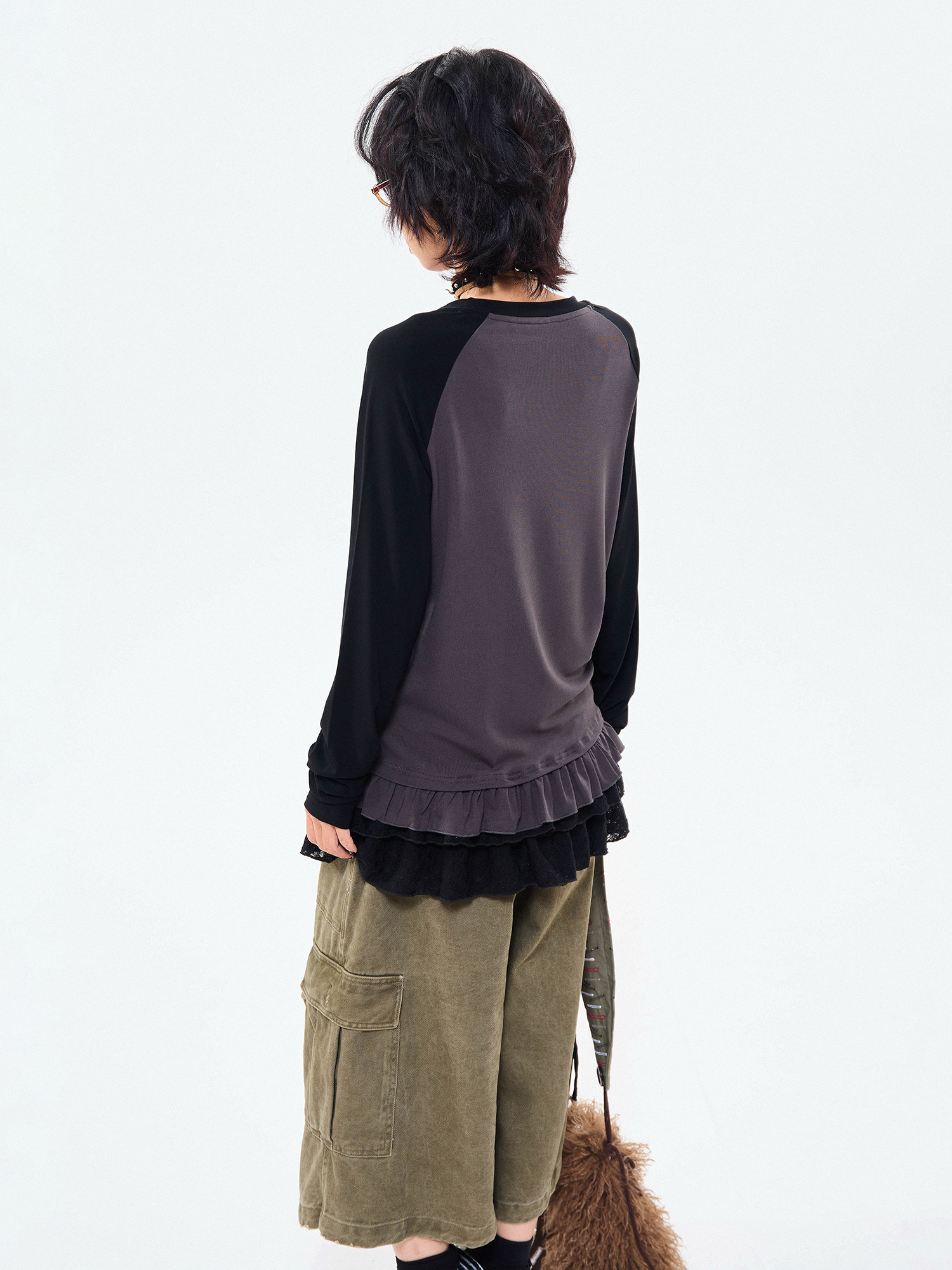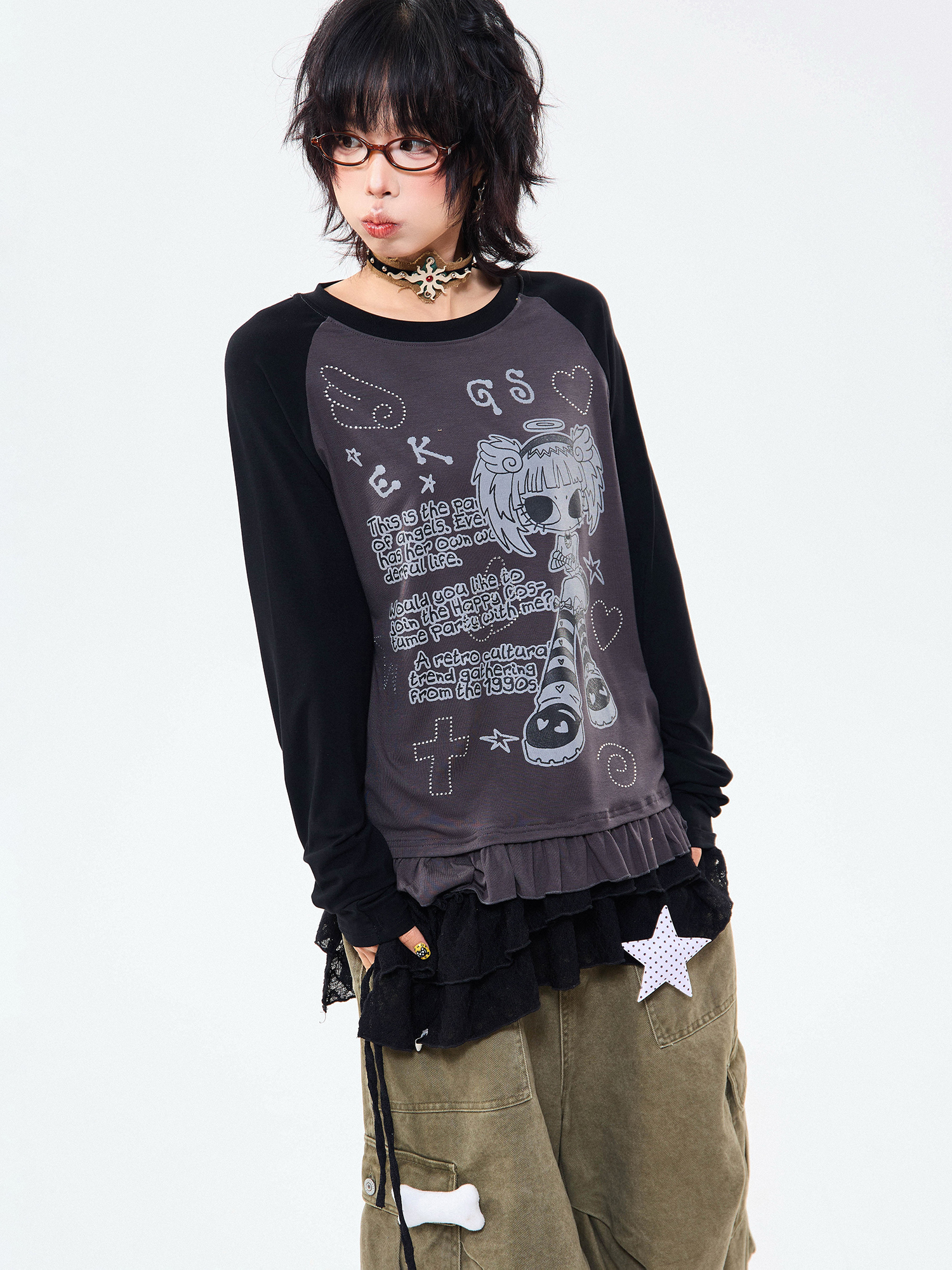 Jimmy The Crew Retro Girl Contrast Lace Long Sleeve Loose Skinny T-Shirt Top