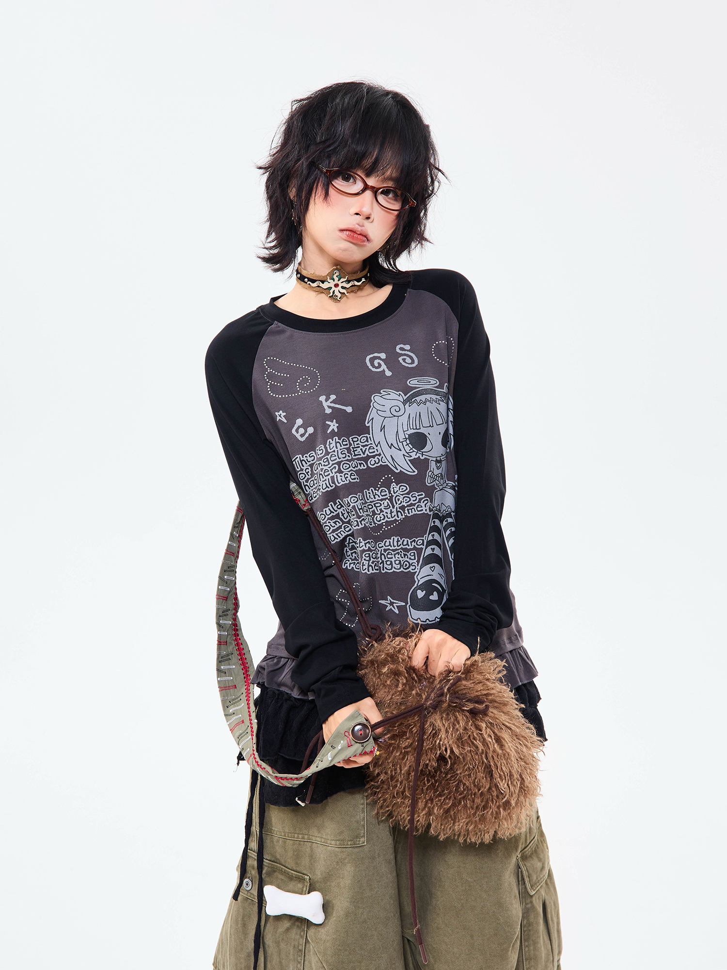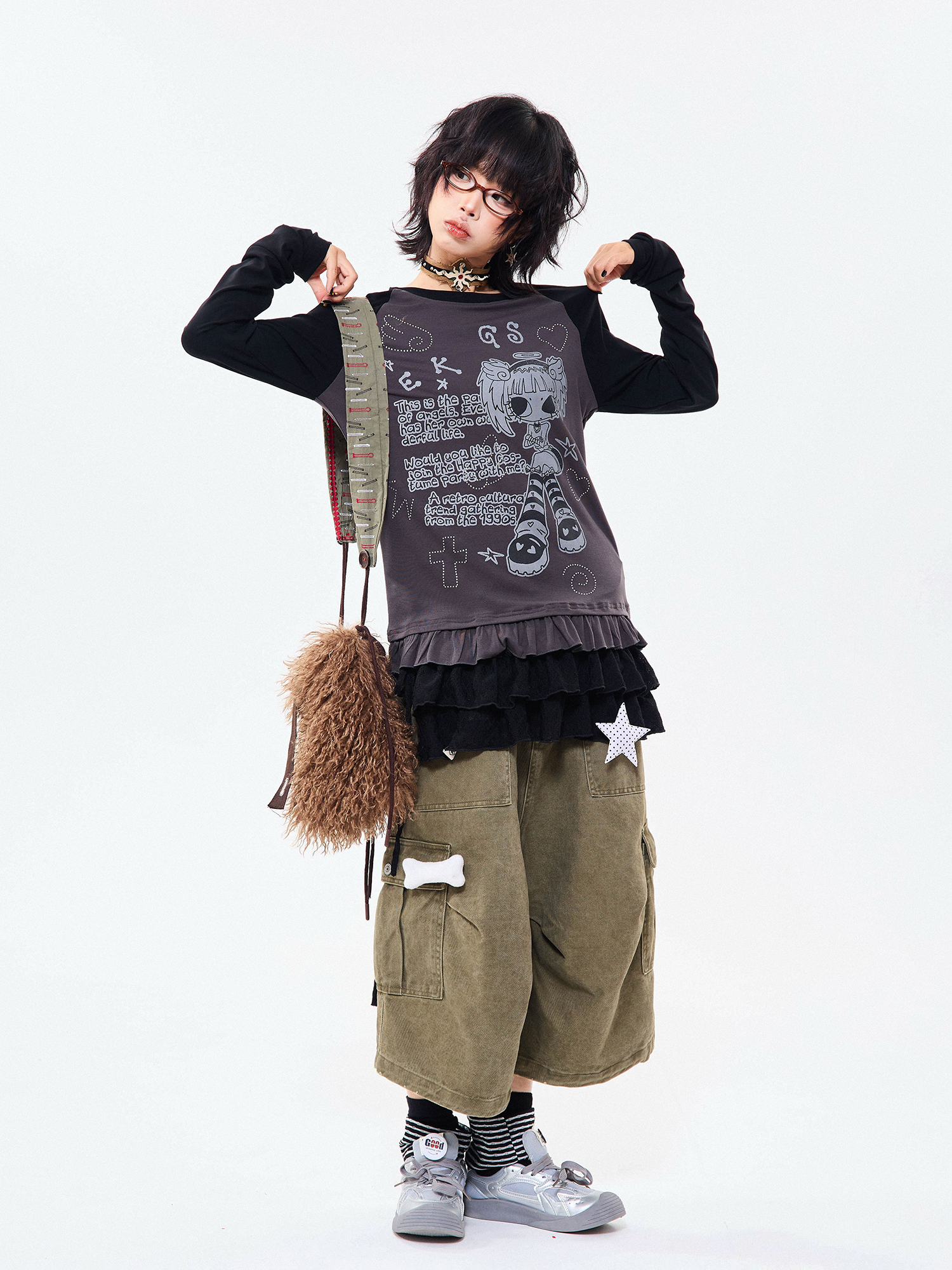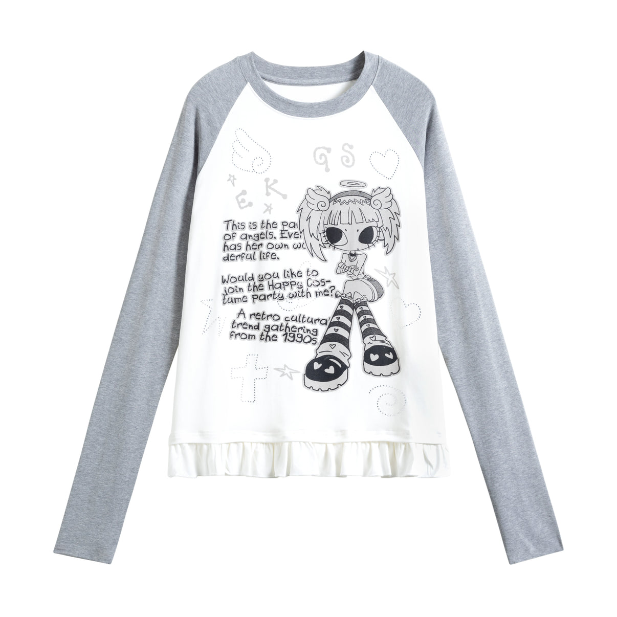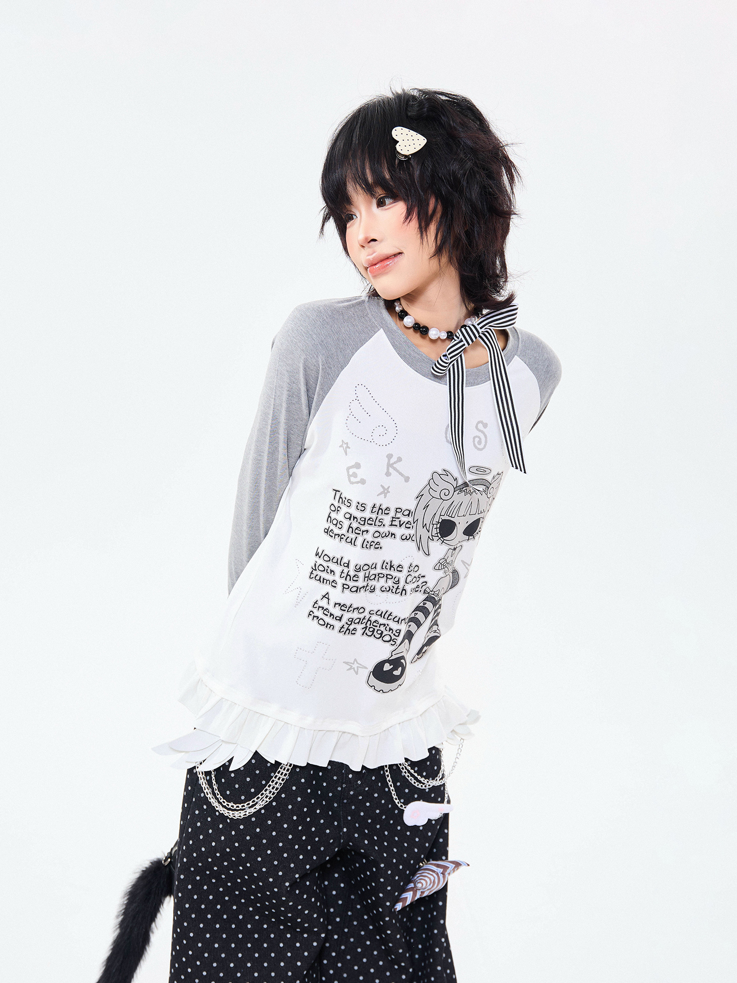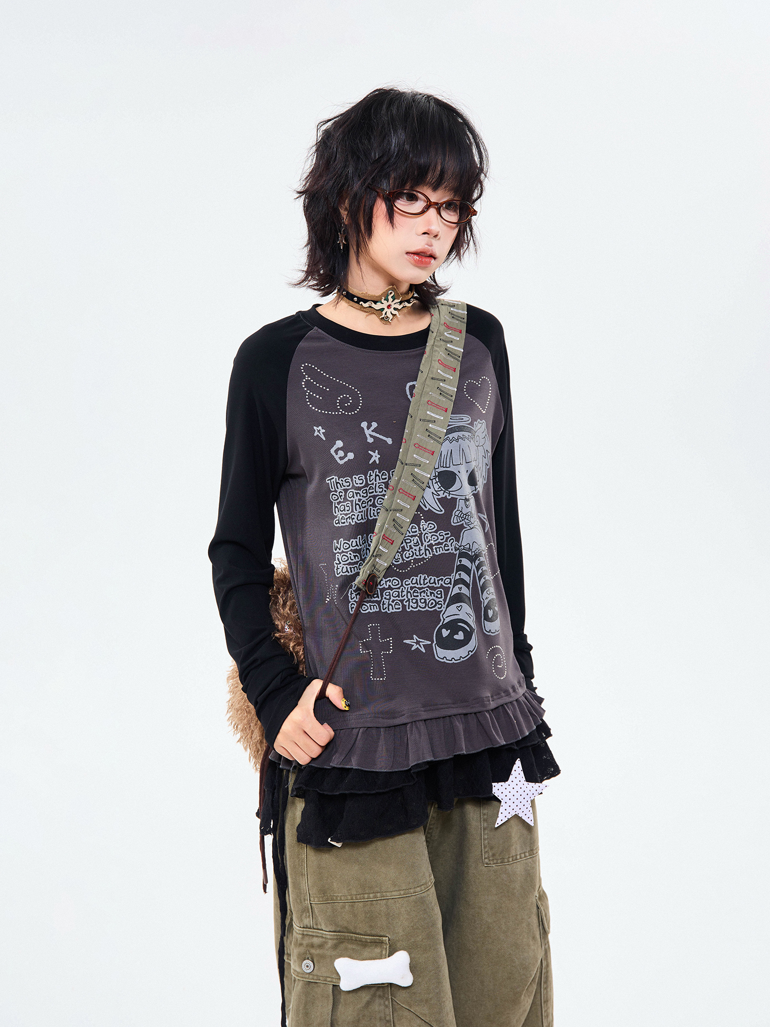 Jimmy The Crew Retro Girl Contrast Lace Long Sleeve Loose Skinny T-Shirt Top
