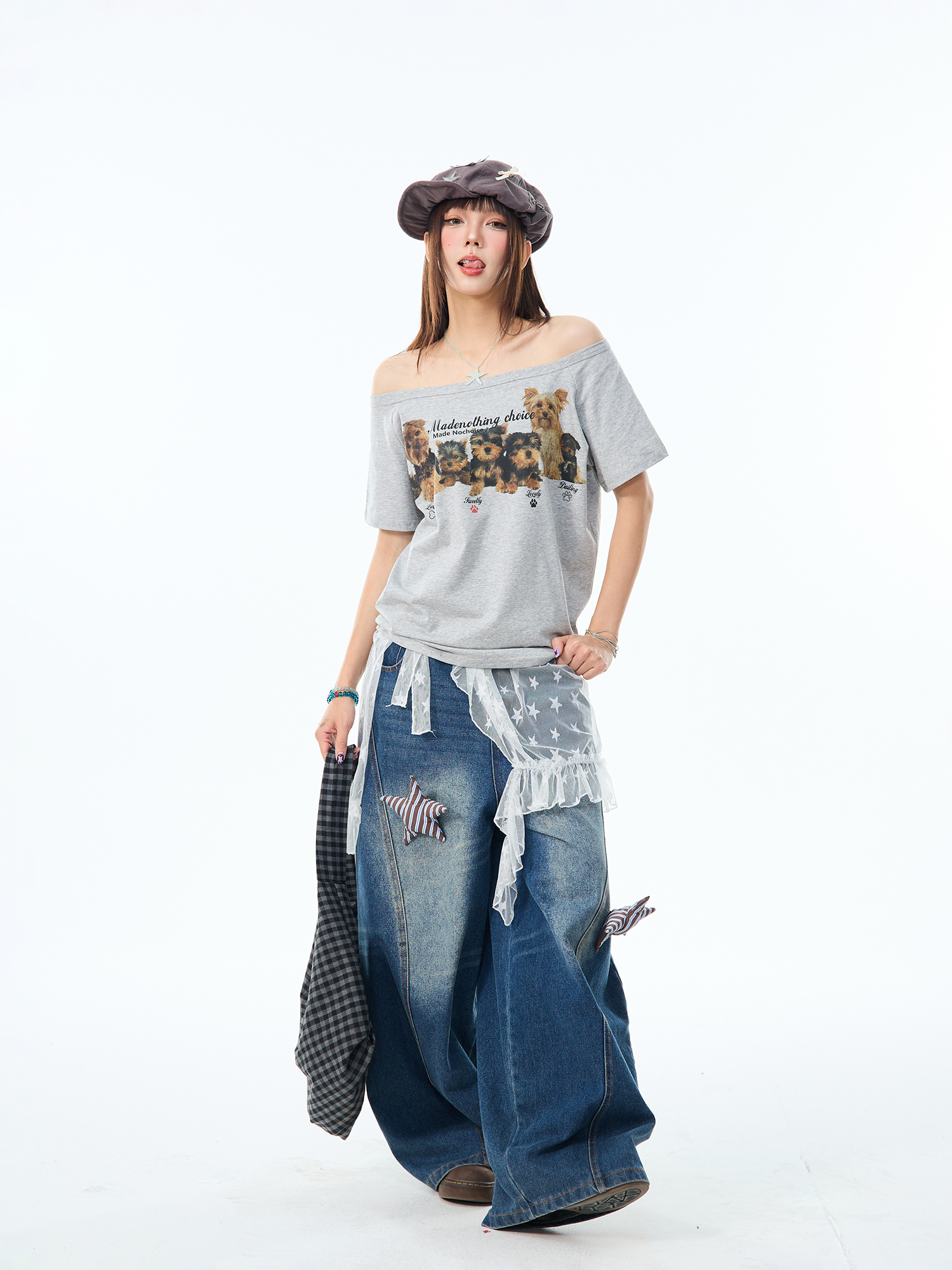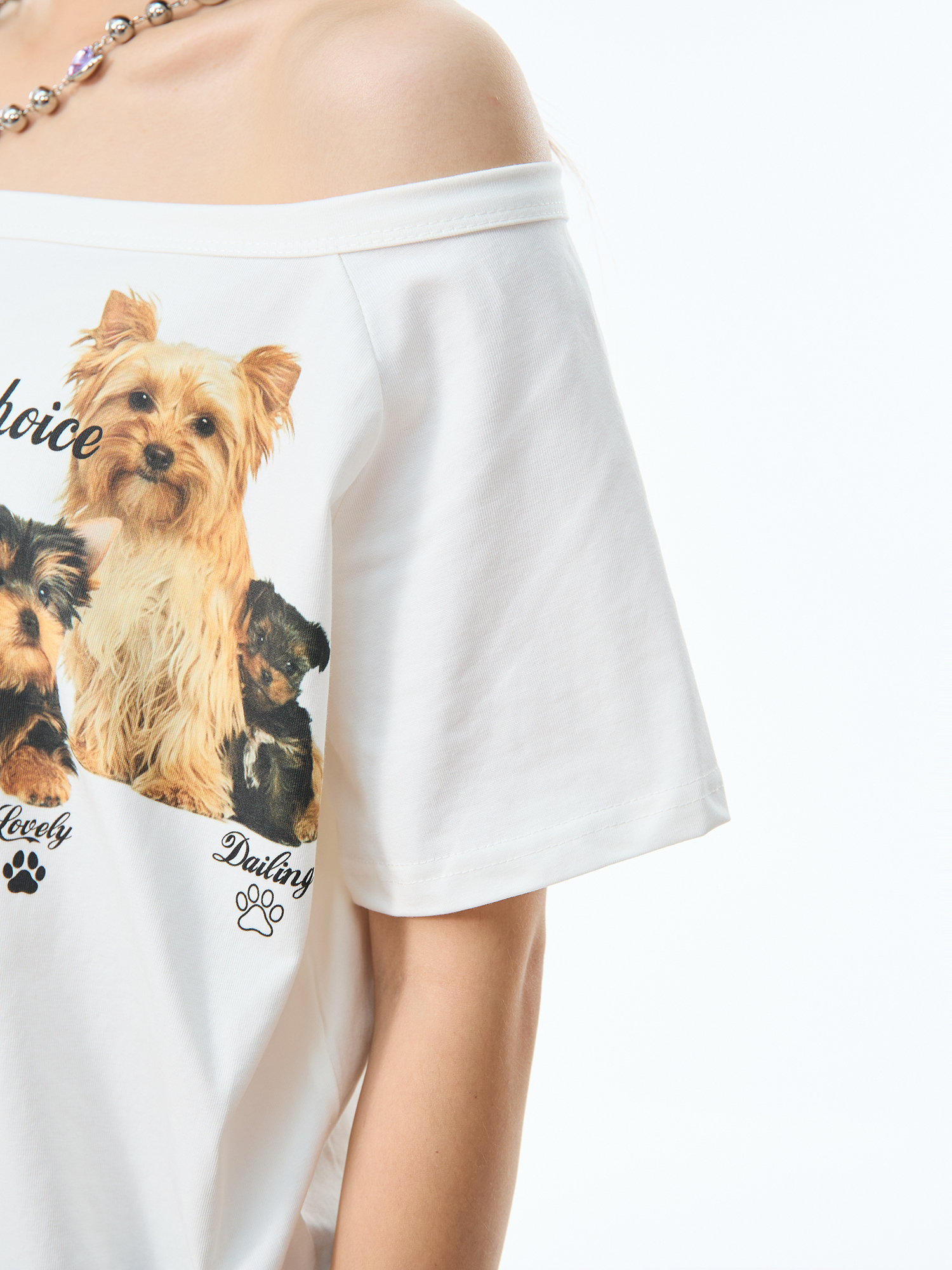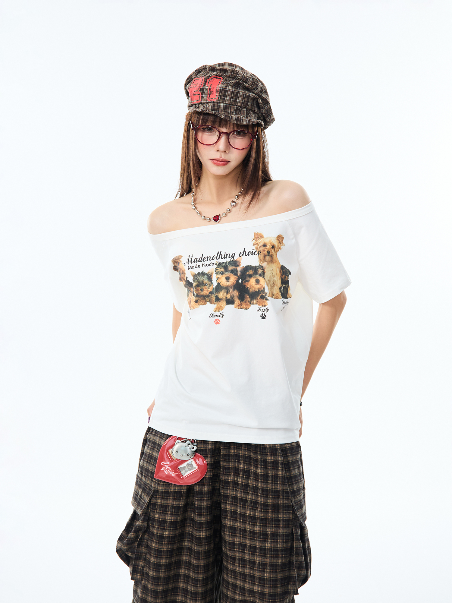 Jimmy The Crew Retro Puppy One-word Shoulder Loose Casual and Thin Slanted Shoulder Short-sleeved T-shirt