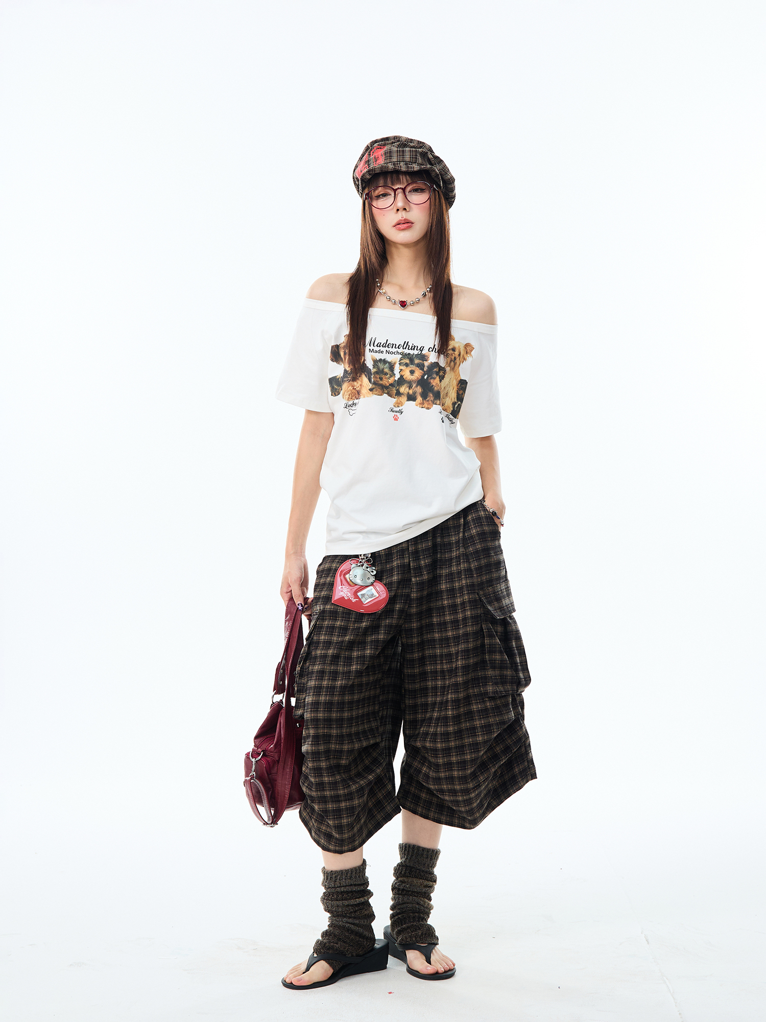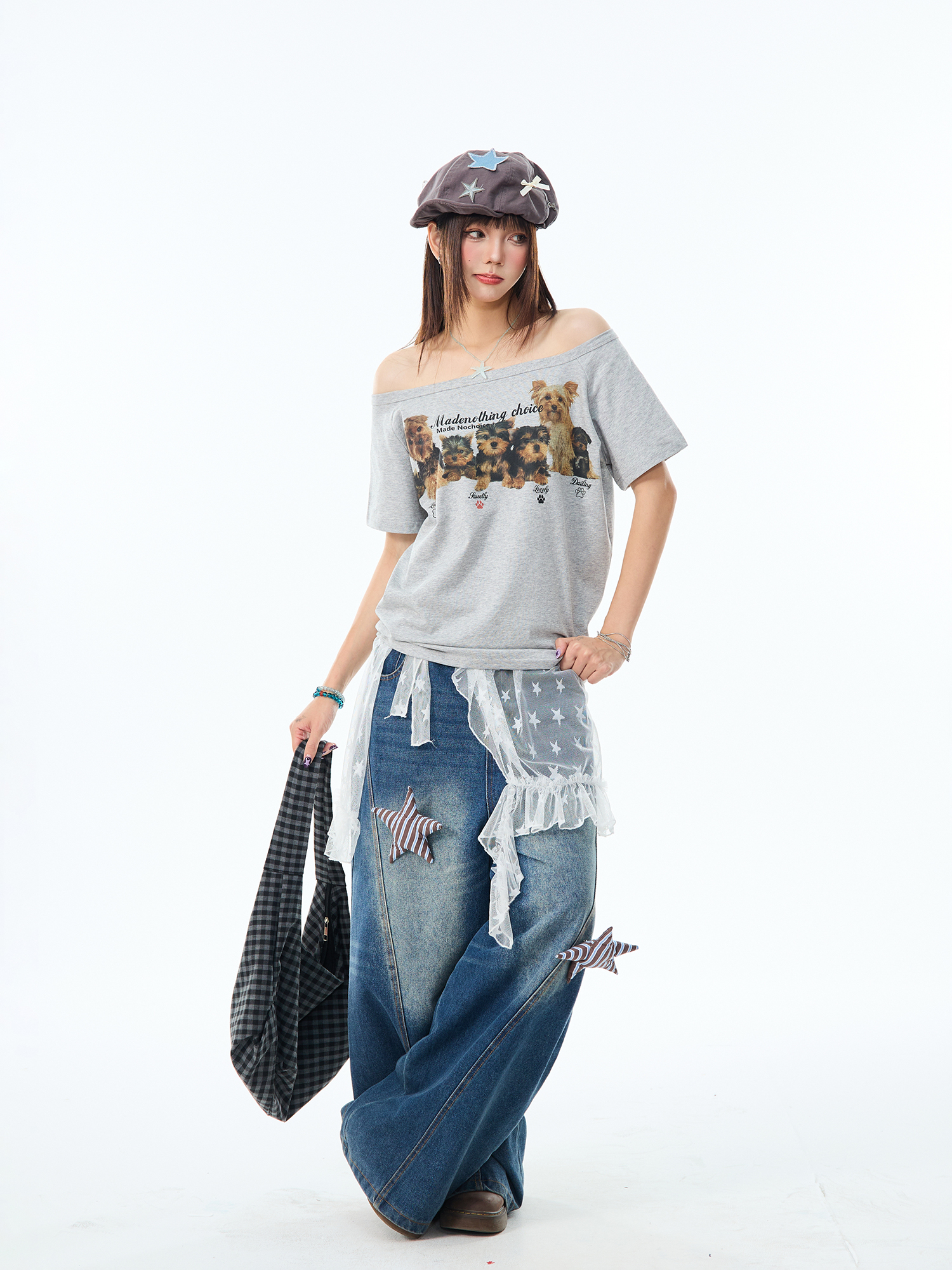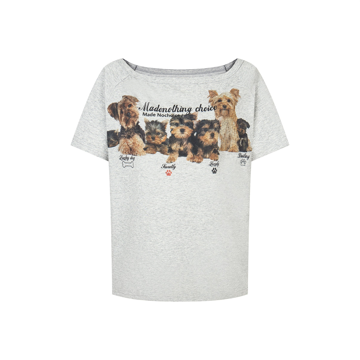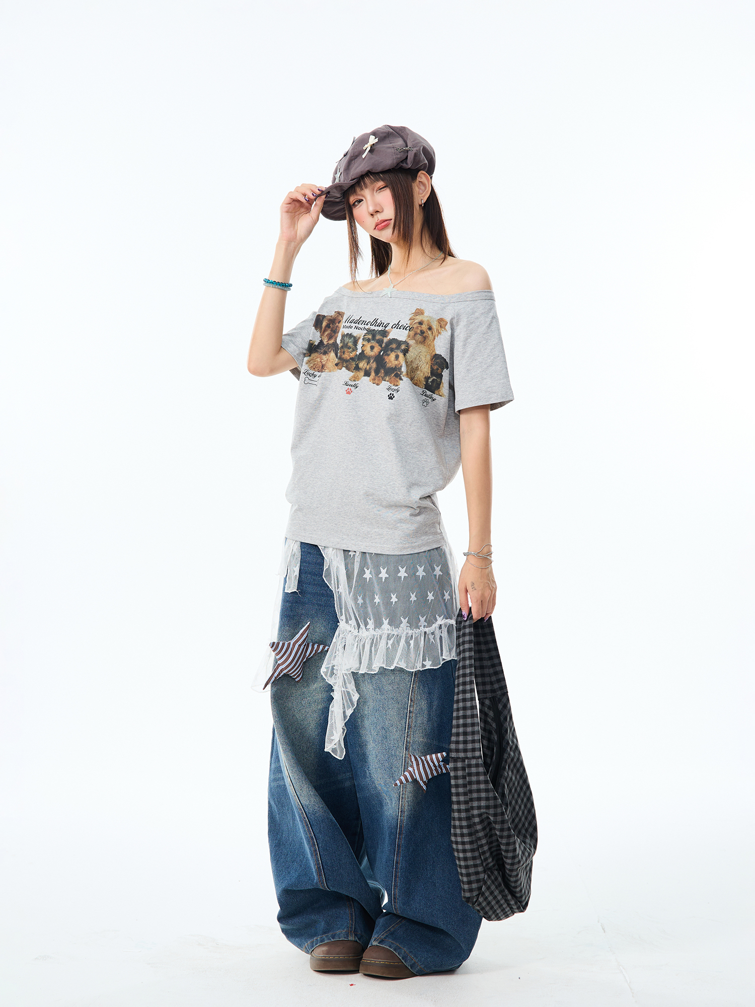 Jimmy The Crew Retro Puppy One-word Shoulder Loose Casual and Thin Slanted Shoulder Short-sleeved T-shirt