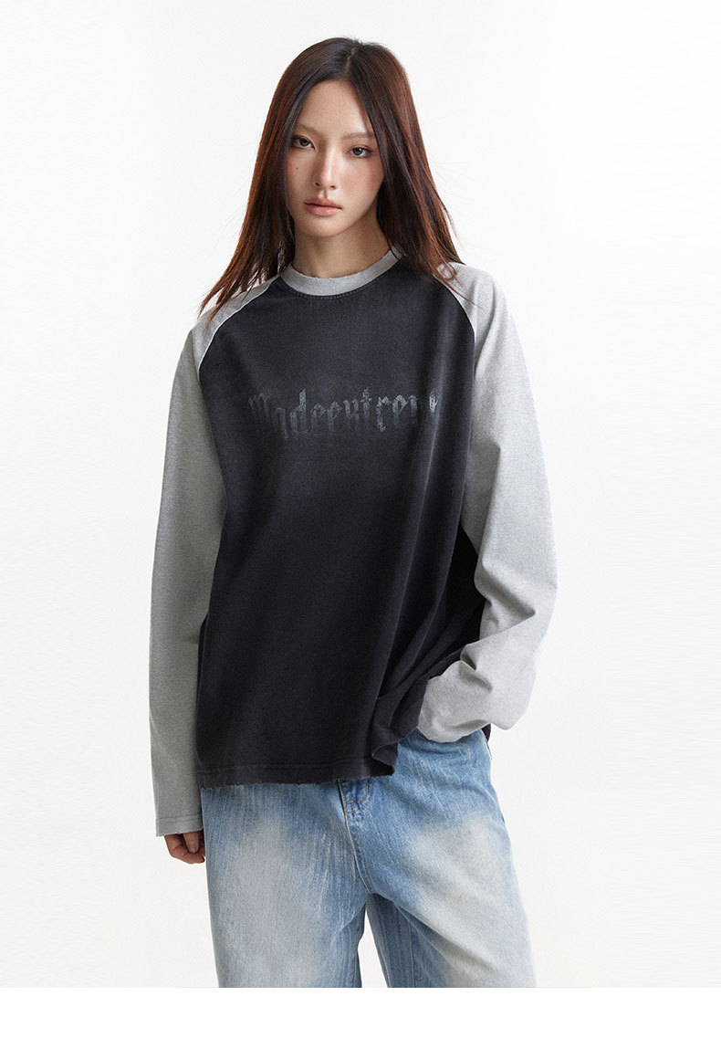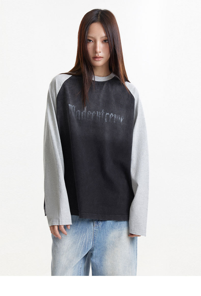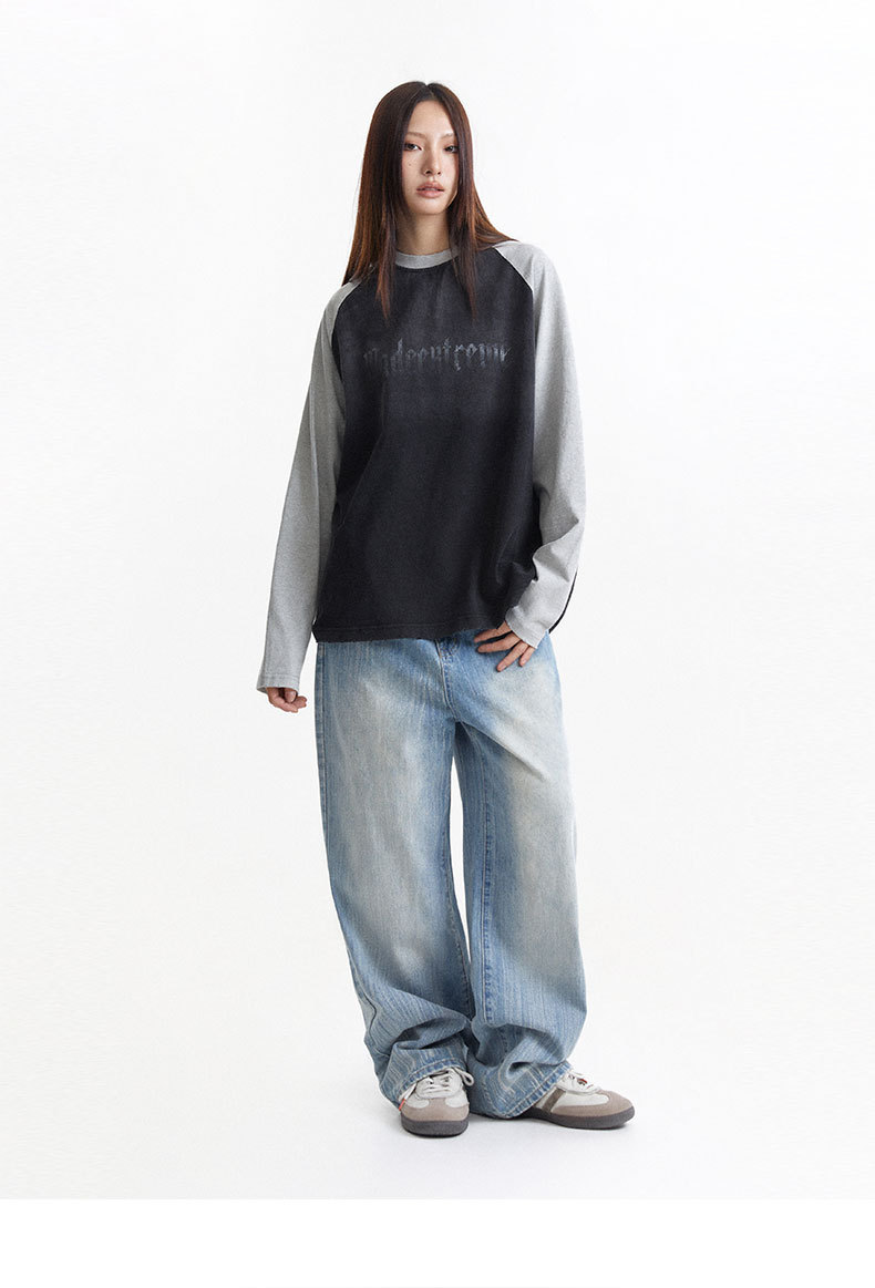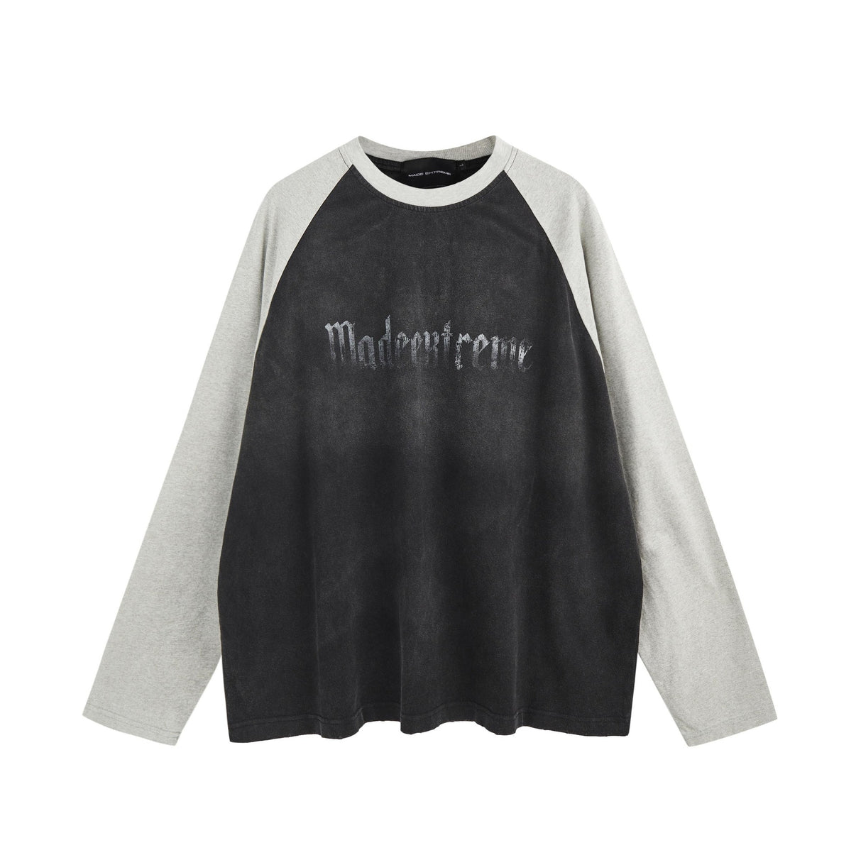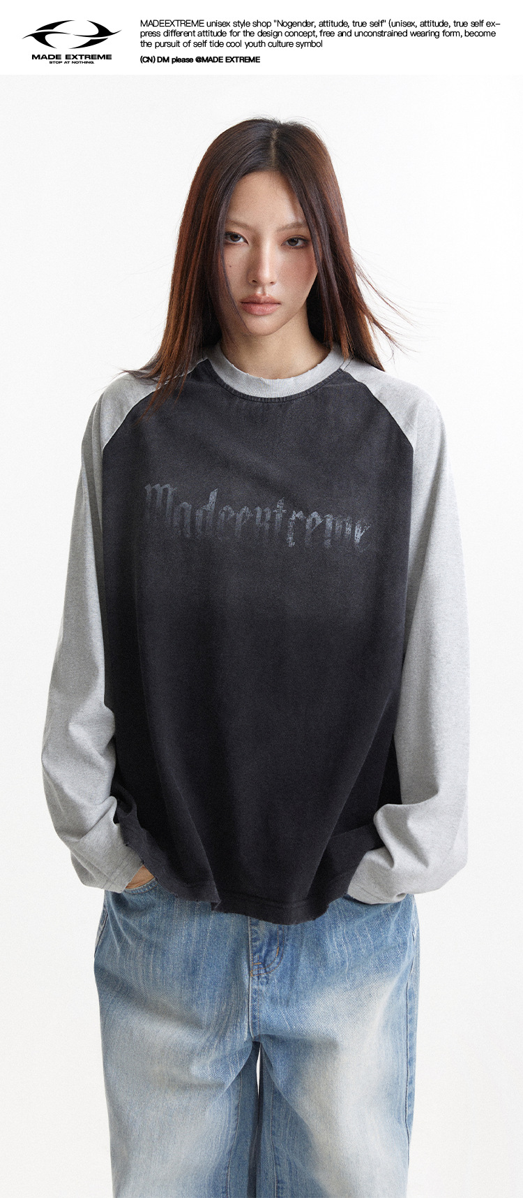 MADEEXTREME Old Washed Alphabet Print Round Neck Loose Shoulder Sleeve Long Sleeve T-shirt
