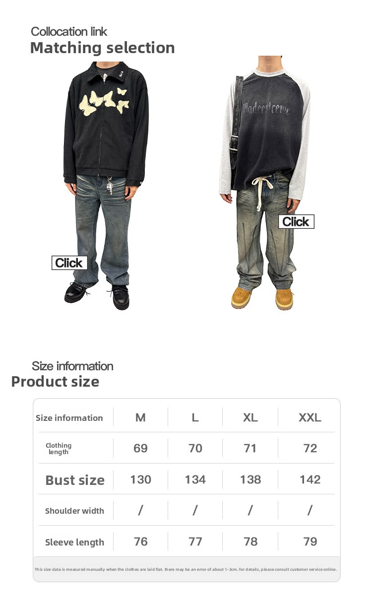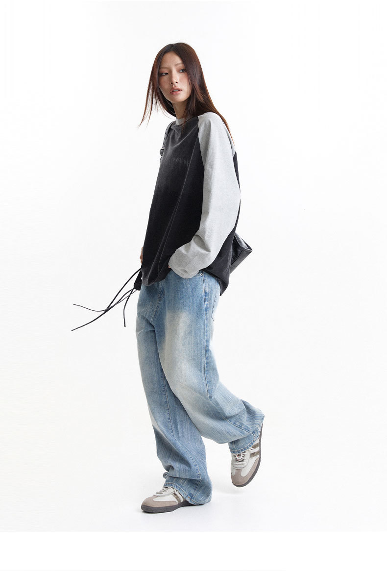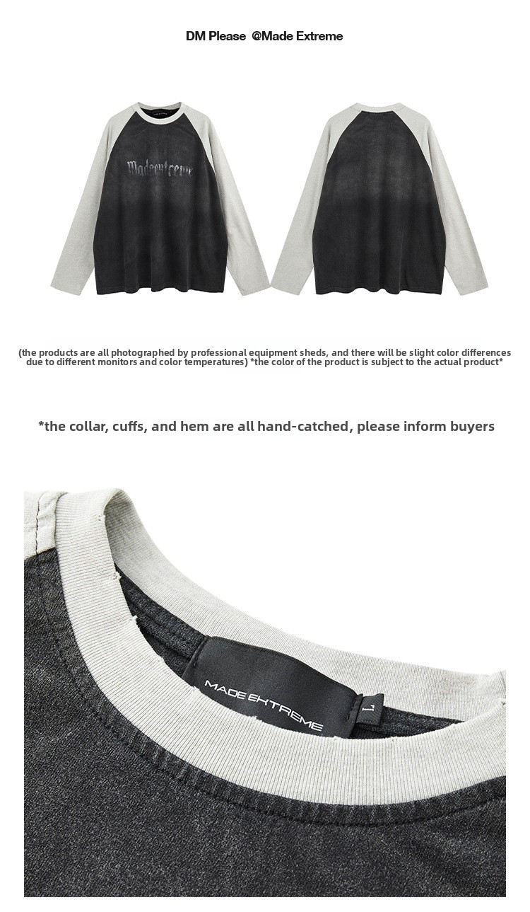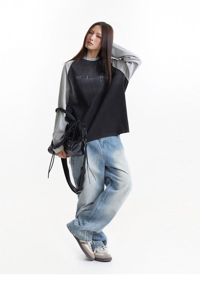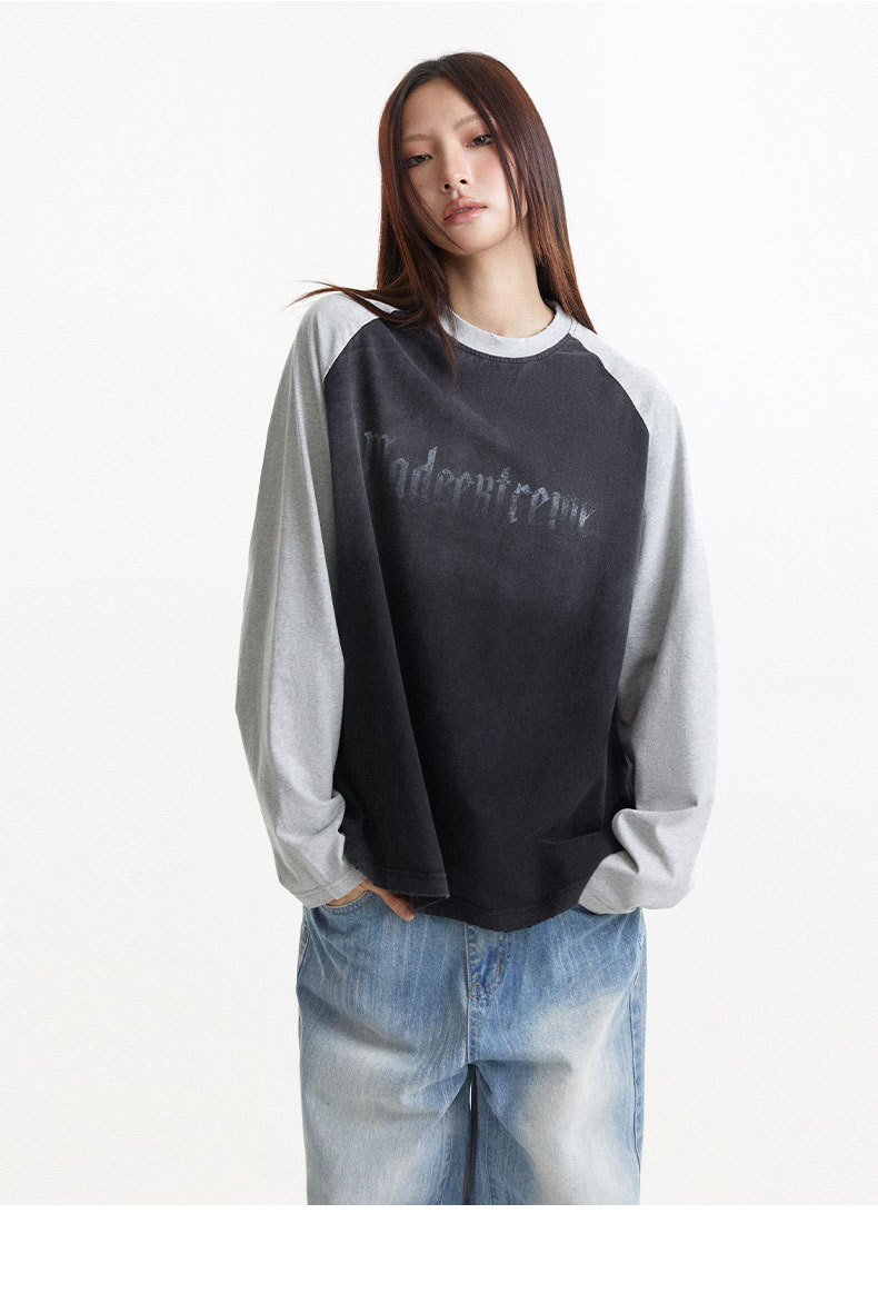 MADEEXTREME Old Washed Alphabet Print Round Neck Loose Shoulder Sleeve Long Sleeve T-shirt
