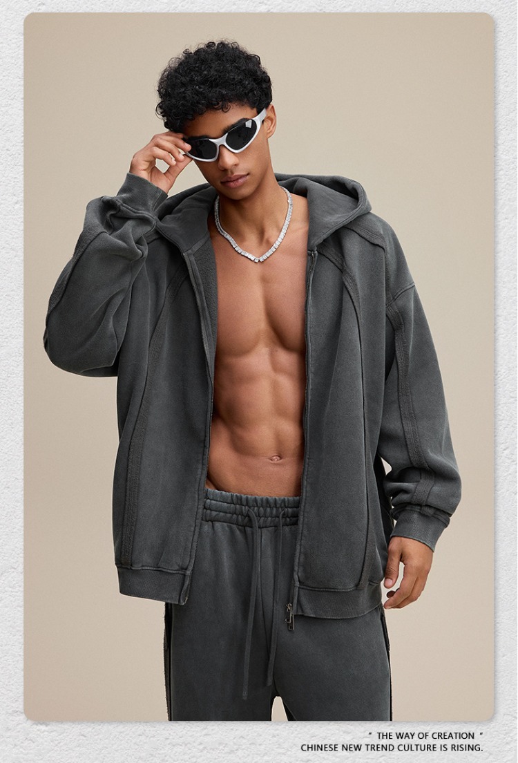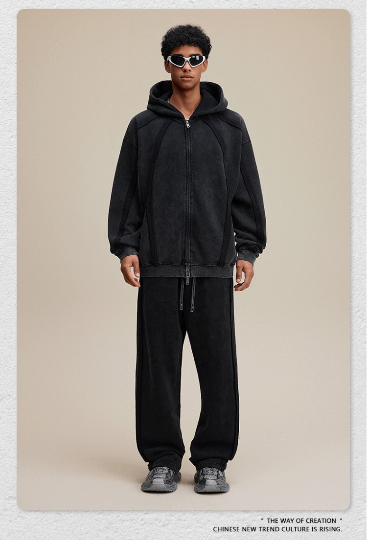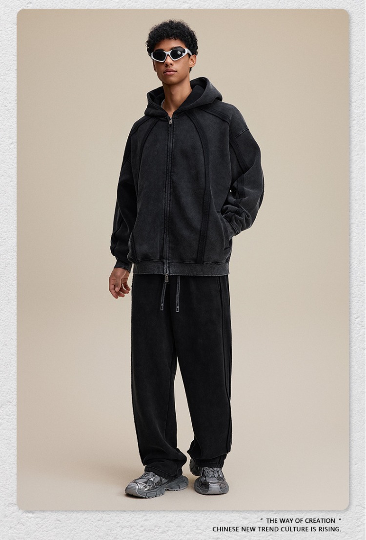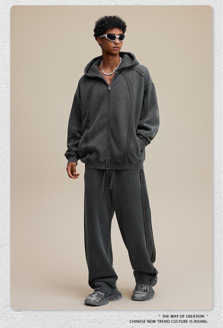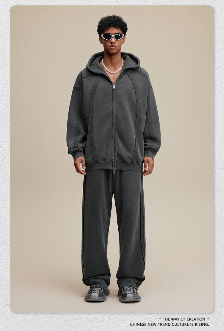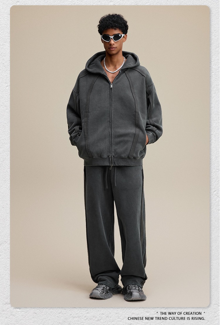 BE Men's Retro Fleece Fried Snowflake Zipper Sweater Straight Pants Set