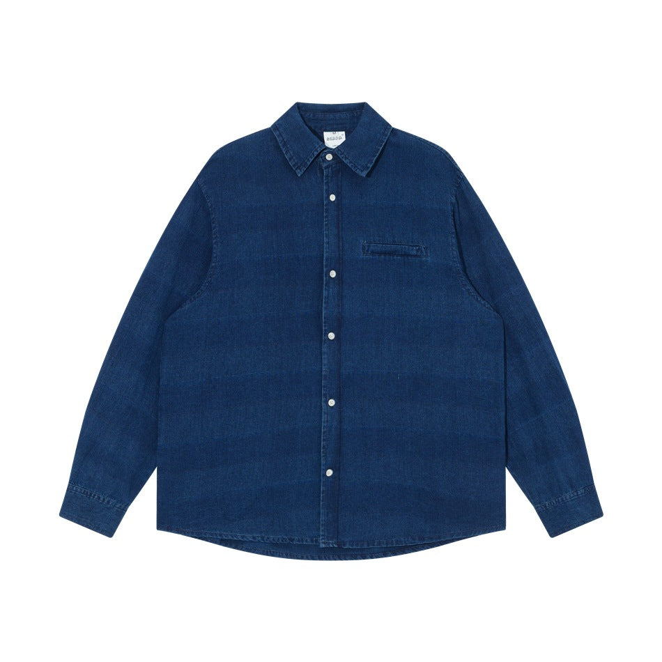Stay ahead of the fashion curve with this timelessly stylish and trendy item. The combination of simplicity and chic design makes our Water-Washed Striped Denim Shirt a must-have addition to every modern wardrobe. Experience the perfect amalgamation of effortless style and contemporary flair with this essential piece.