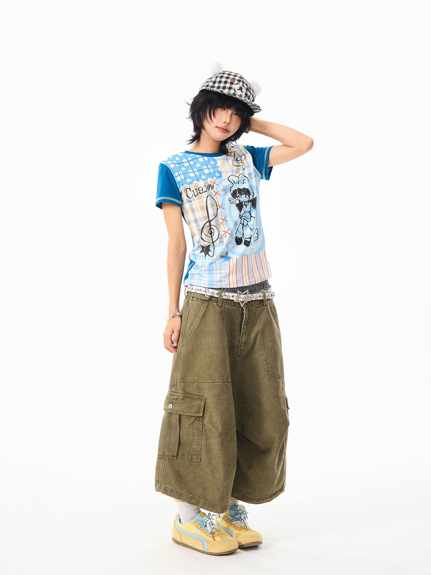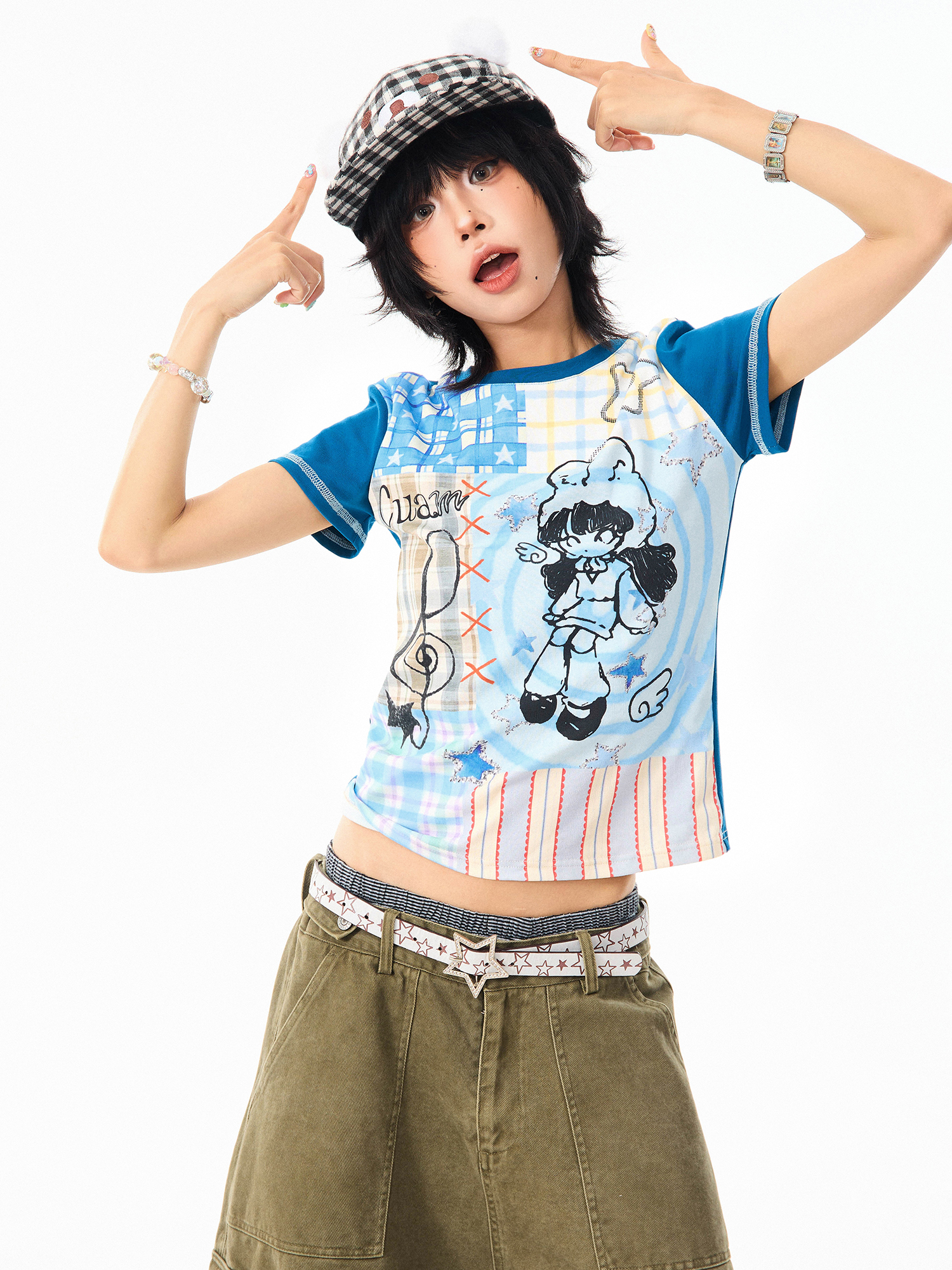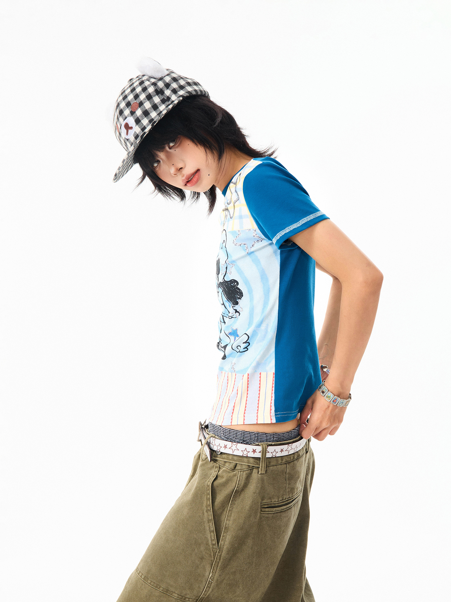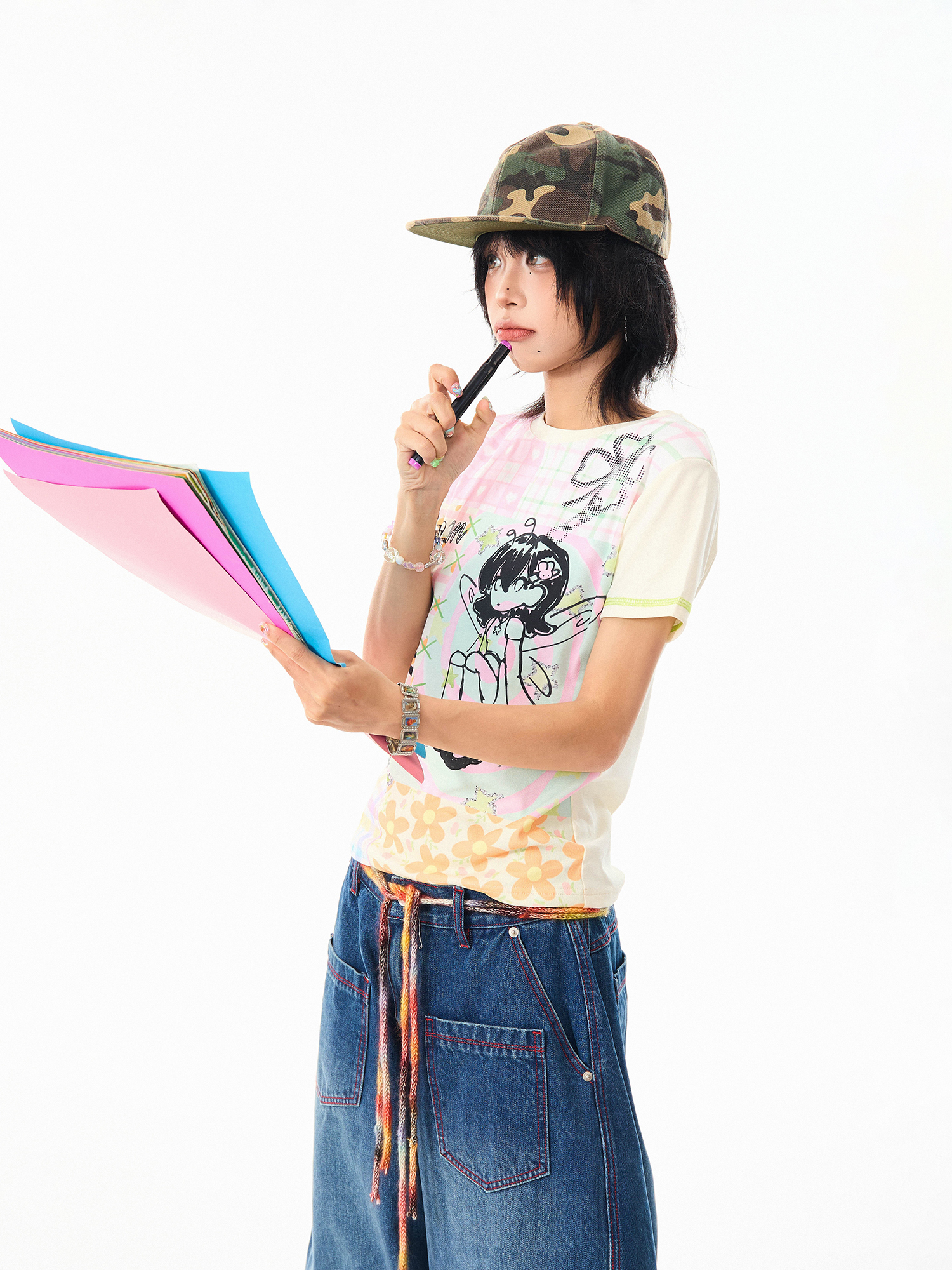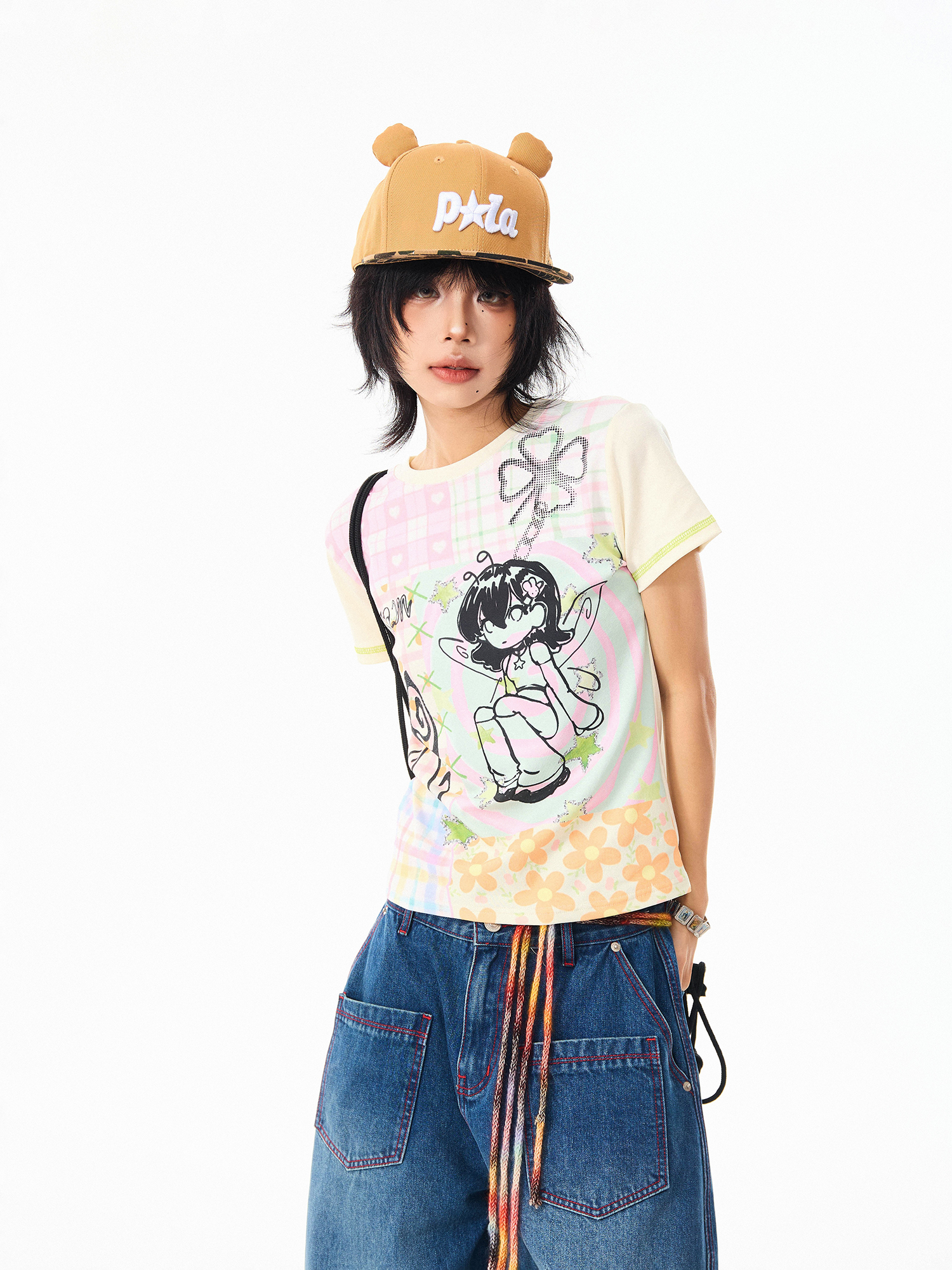 Jimmy The Crew Hand-painted Cartoon Color Matching Front Shoulder Design Slim-fitting Y2k Short-sleeved Top